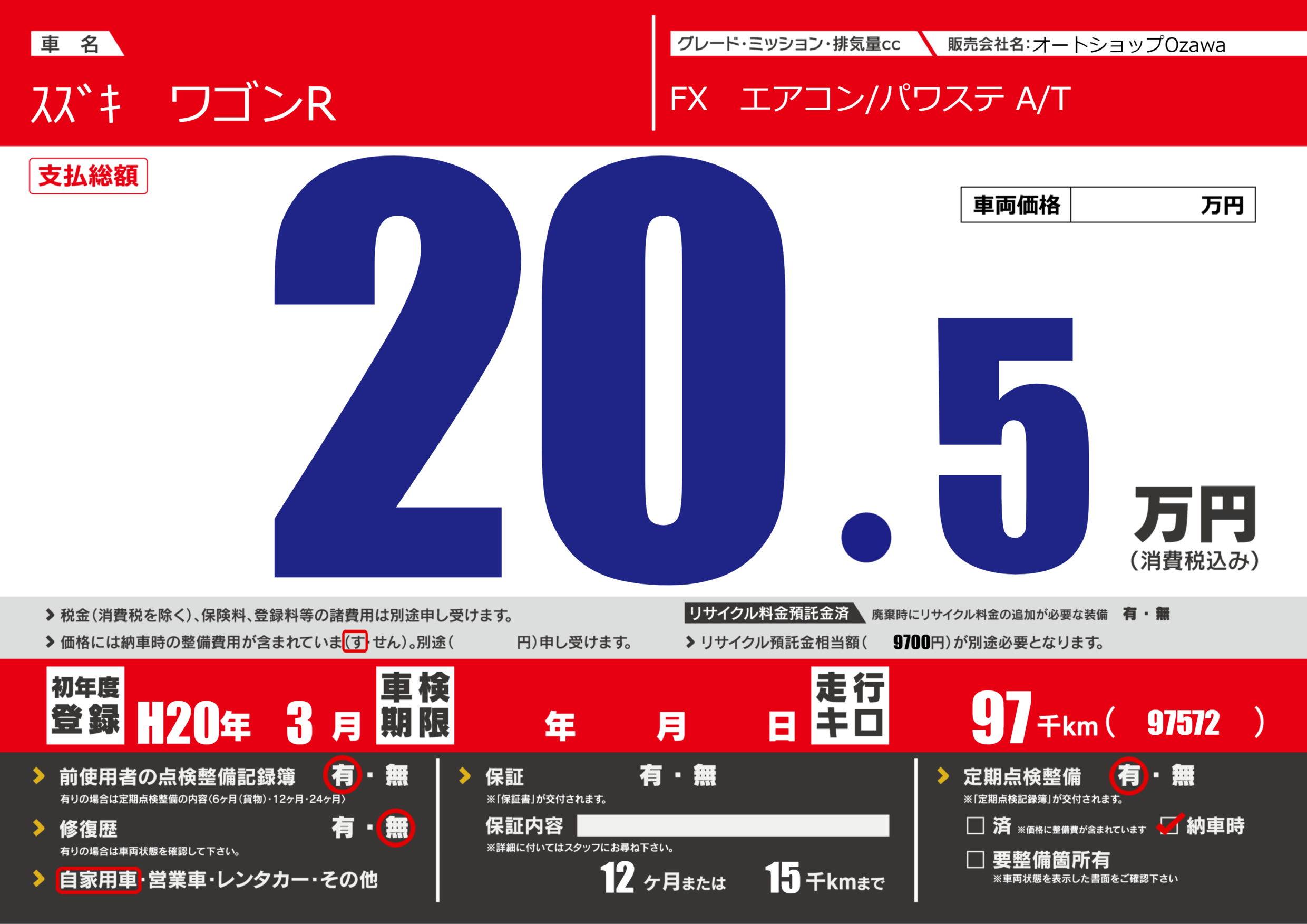 | 車名 | スズキ ワゴンR | グレード ミッション 排気量 |