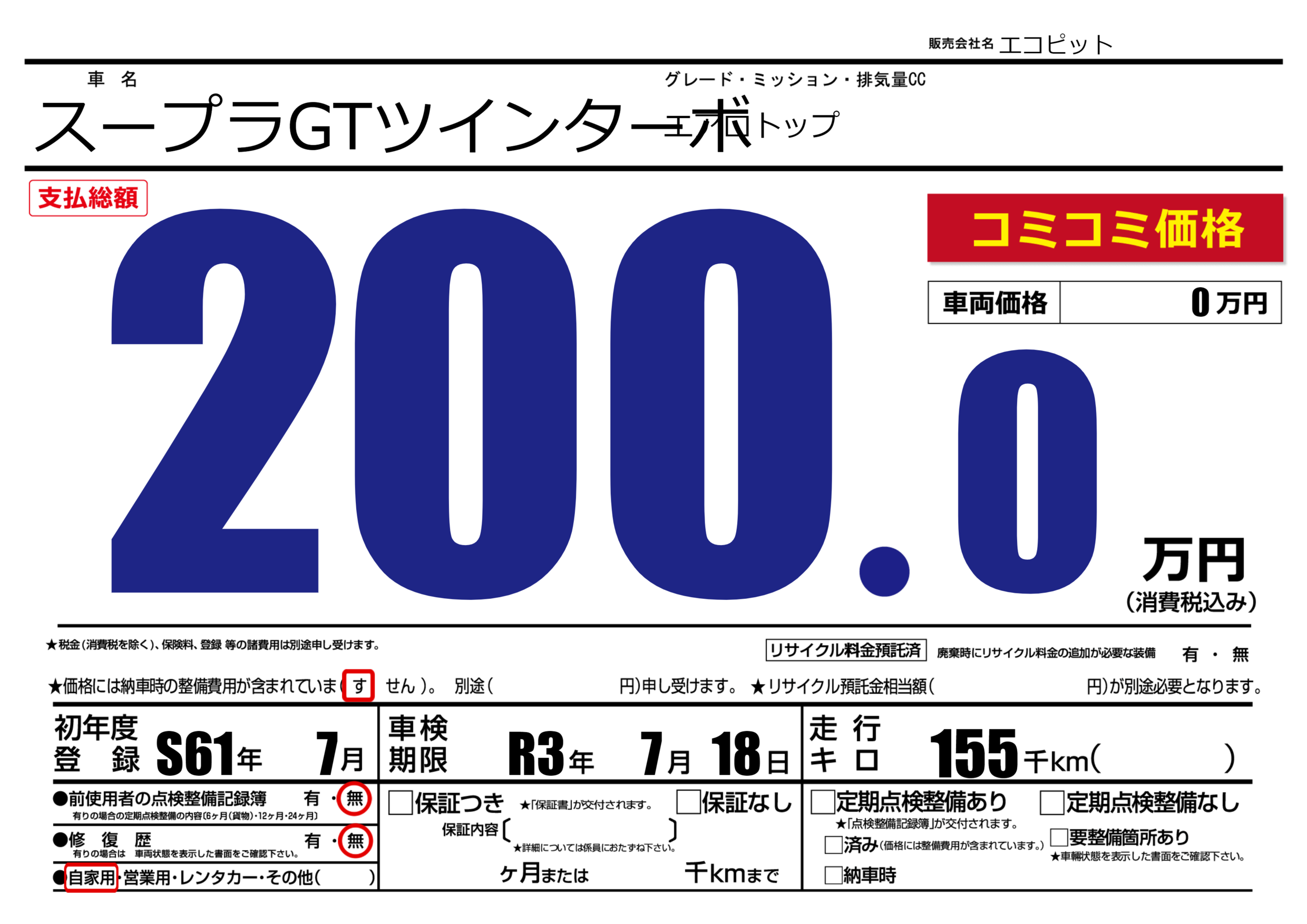 | 車名 | スープラGTツインターボ | グレード ミッション 排気量 |