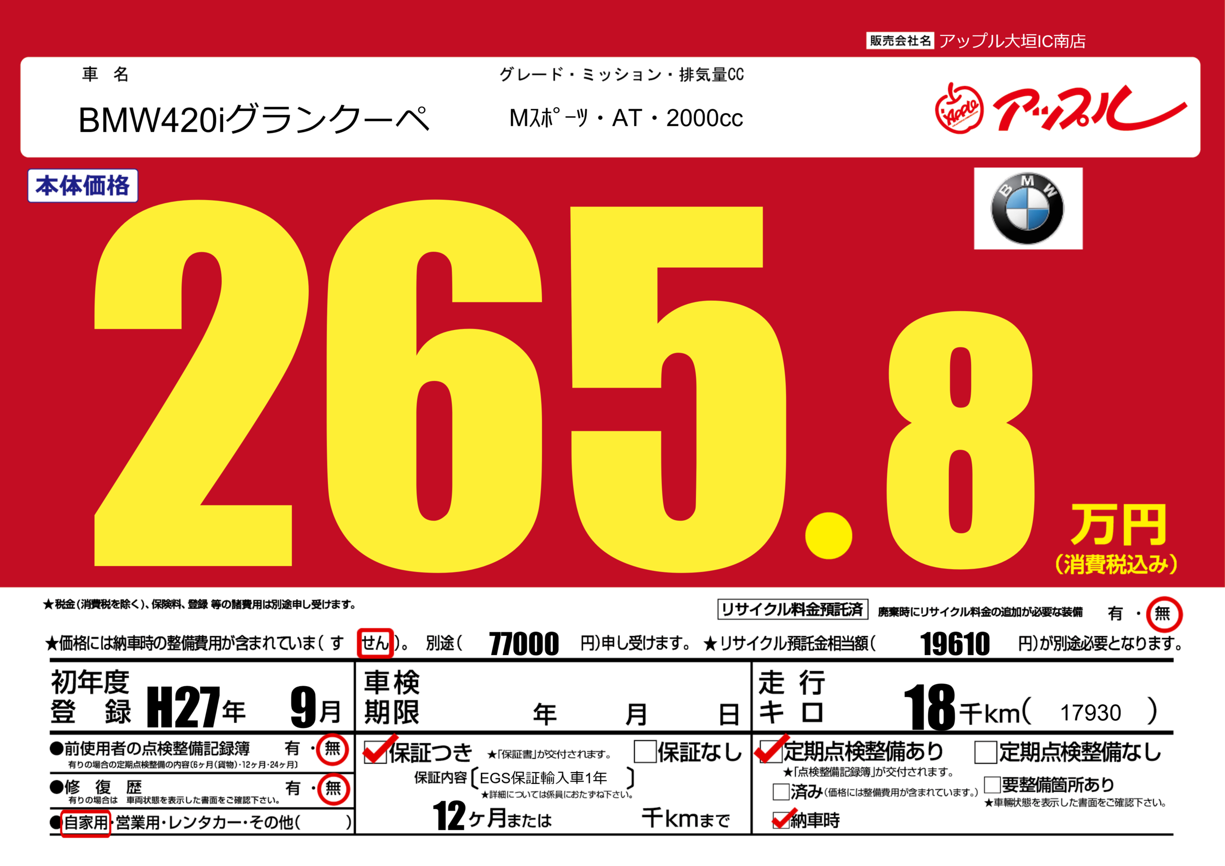 | 車名 | BMW420iグランクーペ | グレード ミッション 排気量 |