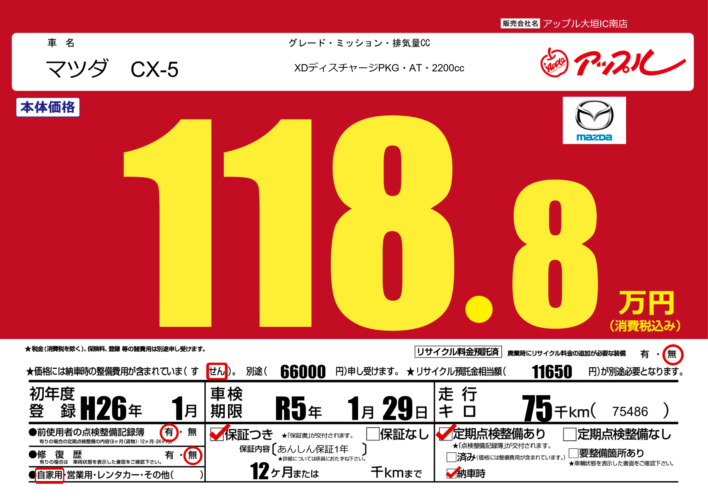 | 車名 | マツダ CX-5 | グレード ミッション 排気量 |