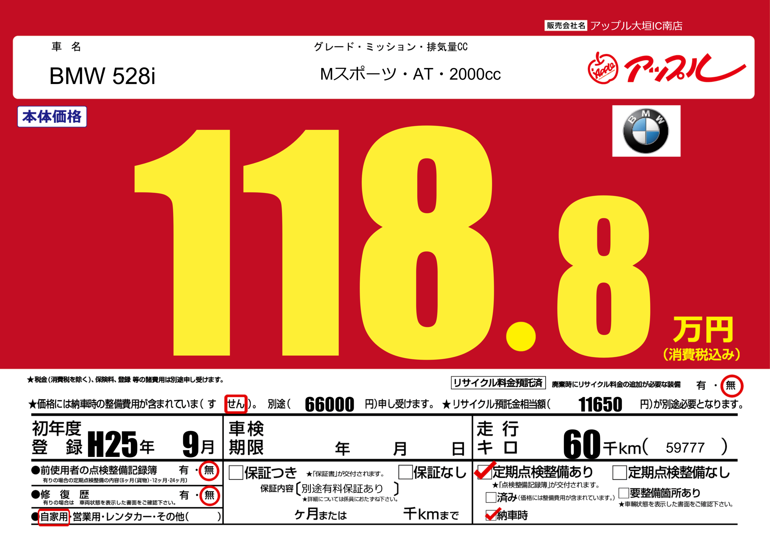| 車名 | BMW 528i | グレード ミッション 排気量 |