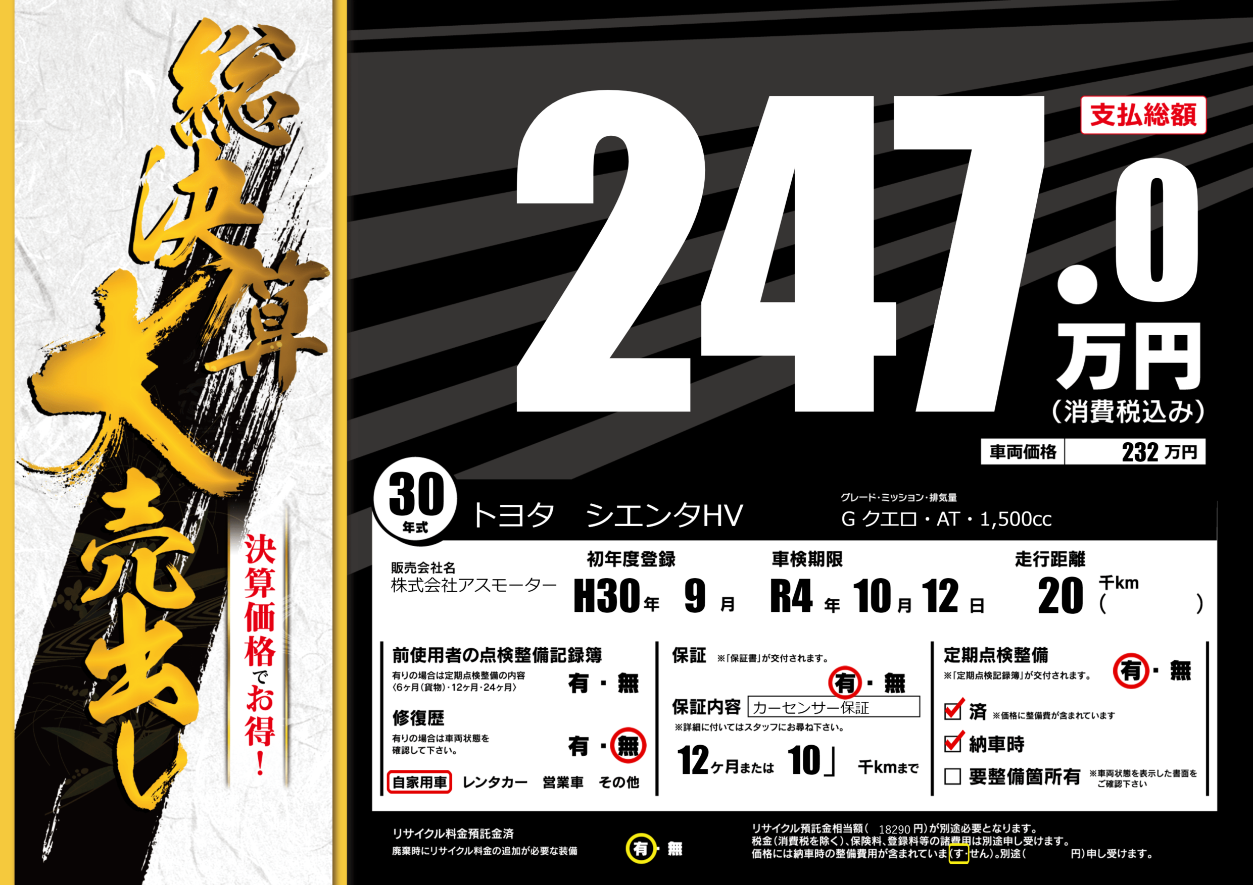 | 車名 | トヨタ シエンタHV | グレード ミッション 排気量 |