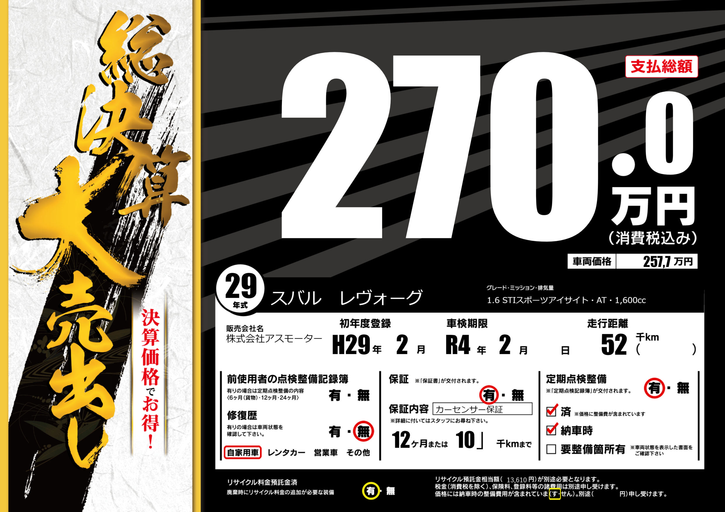| 車名 | スバル レヴォーグ | グレード ミッション 排気量 |