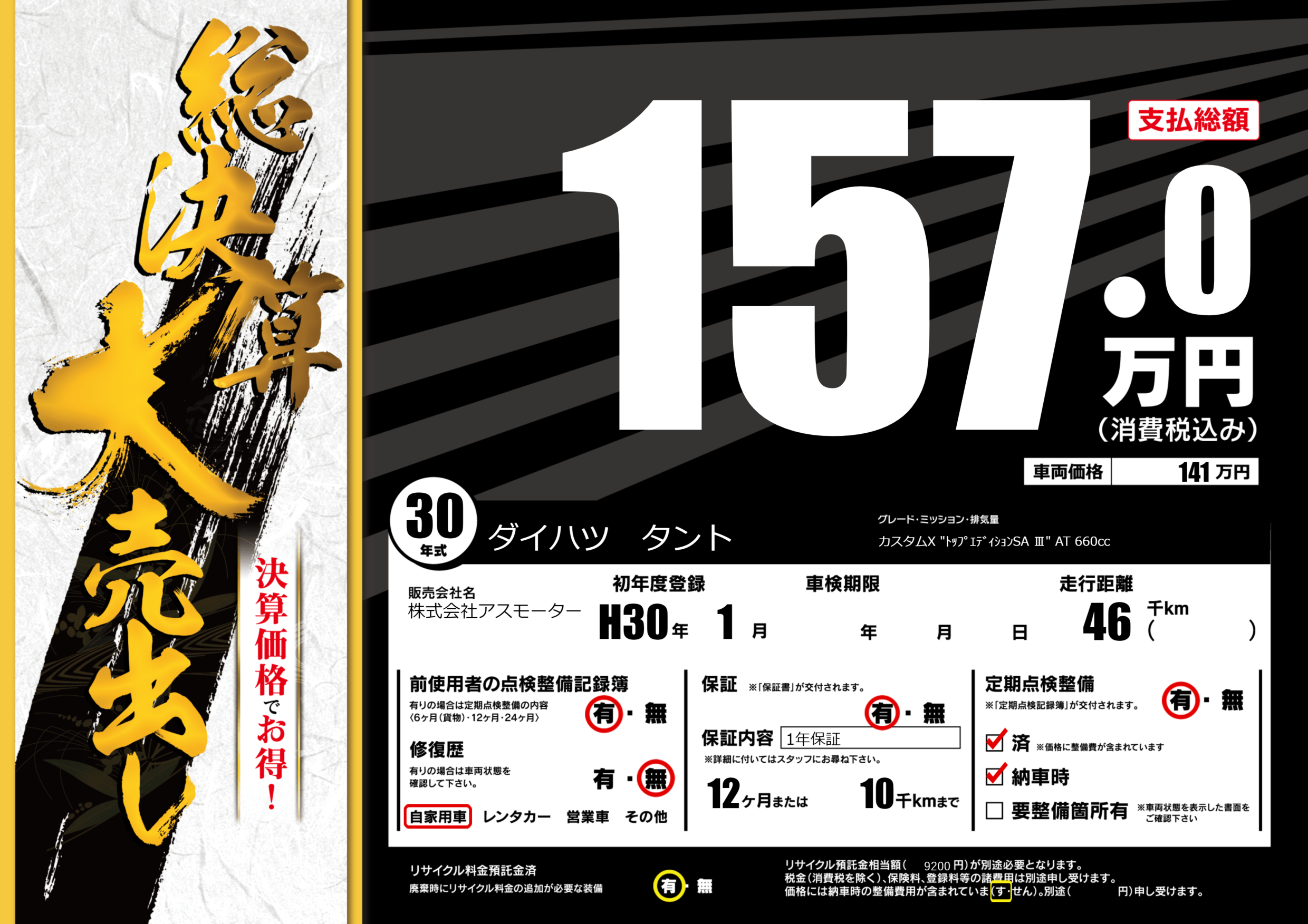 | 定期点検整備 | 定期点検整備あり 定期点検整備済み 納車時あり | ||