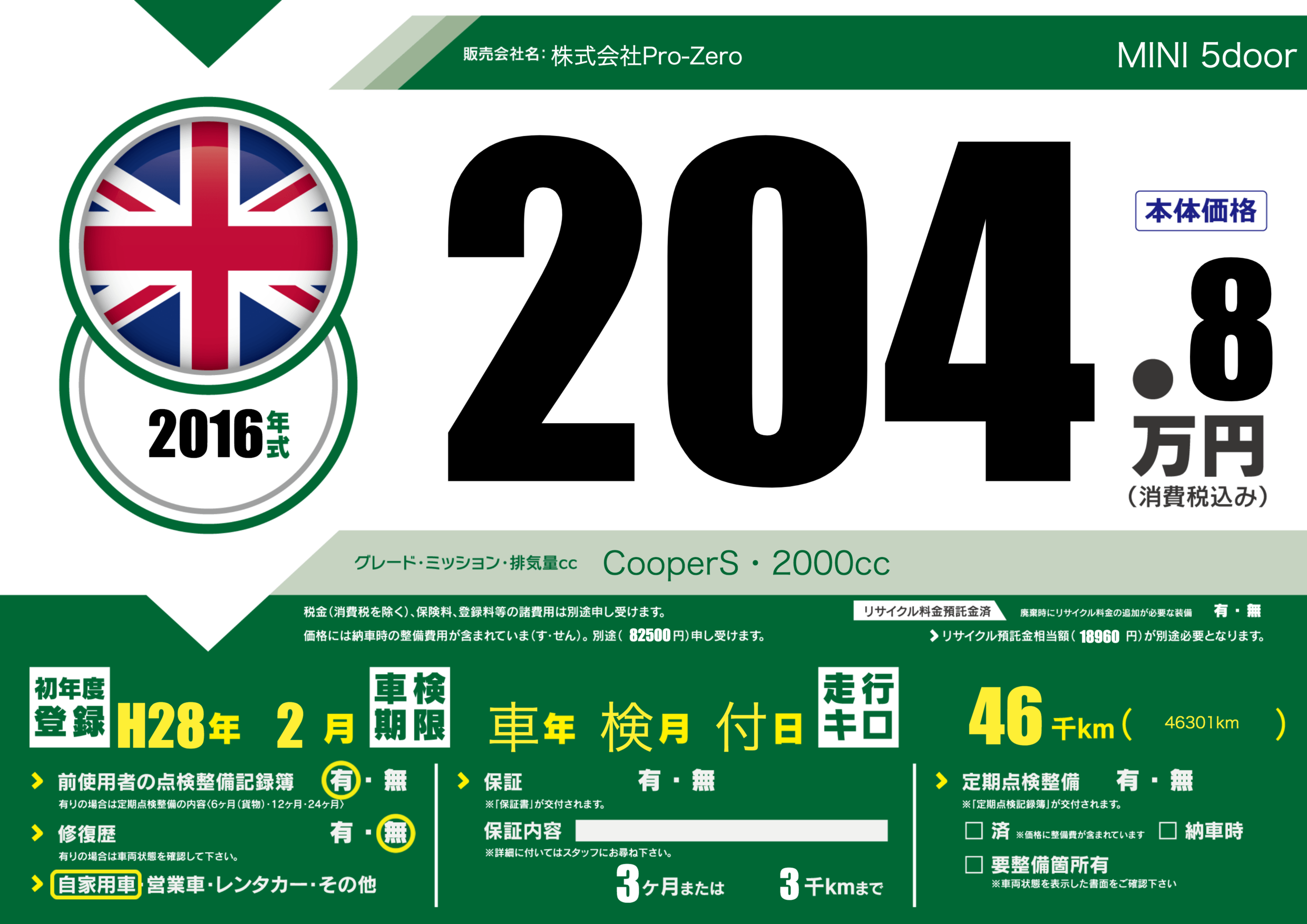 | 車名 | MINI 5door | グレード ミッション 排気量 |
