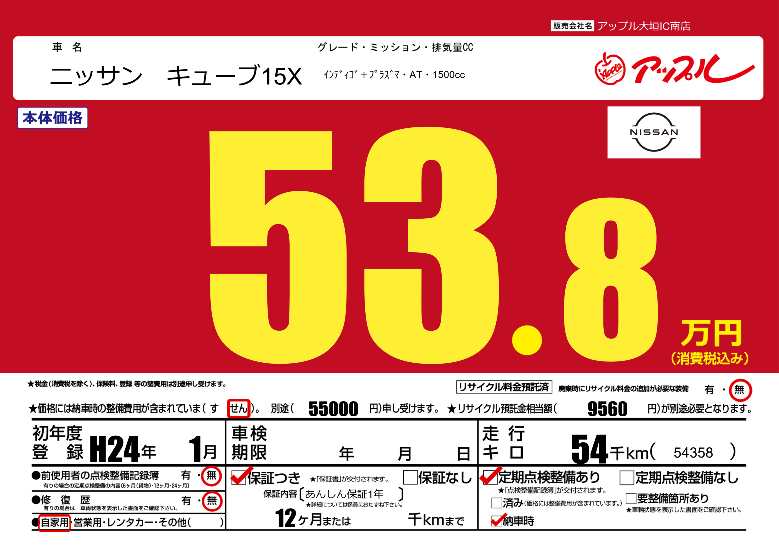 | 車名 | ニッサン キューブ15X | グレード ミッション 排気量 |