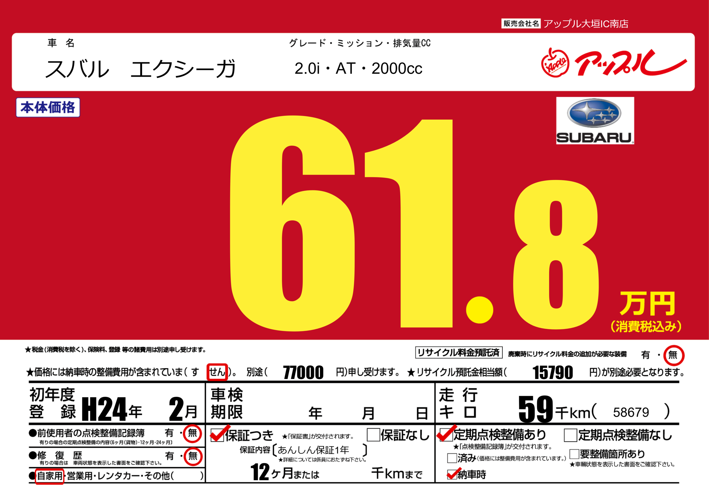 | 車名 | スバル エクシーガ | グレード ミッション 排気量 |