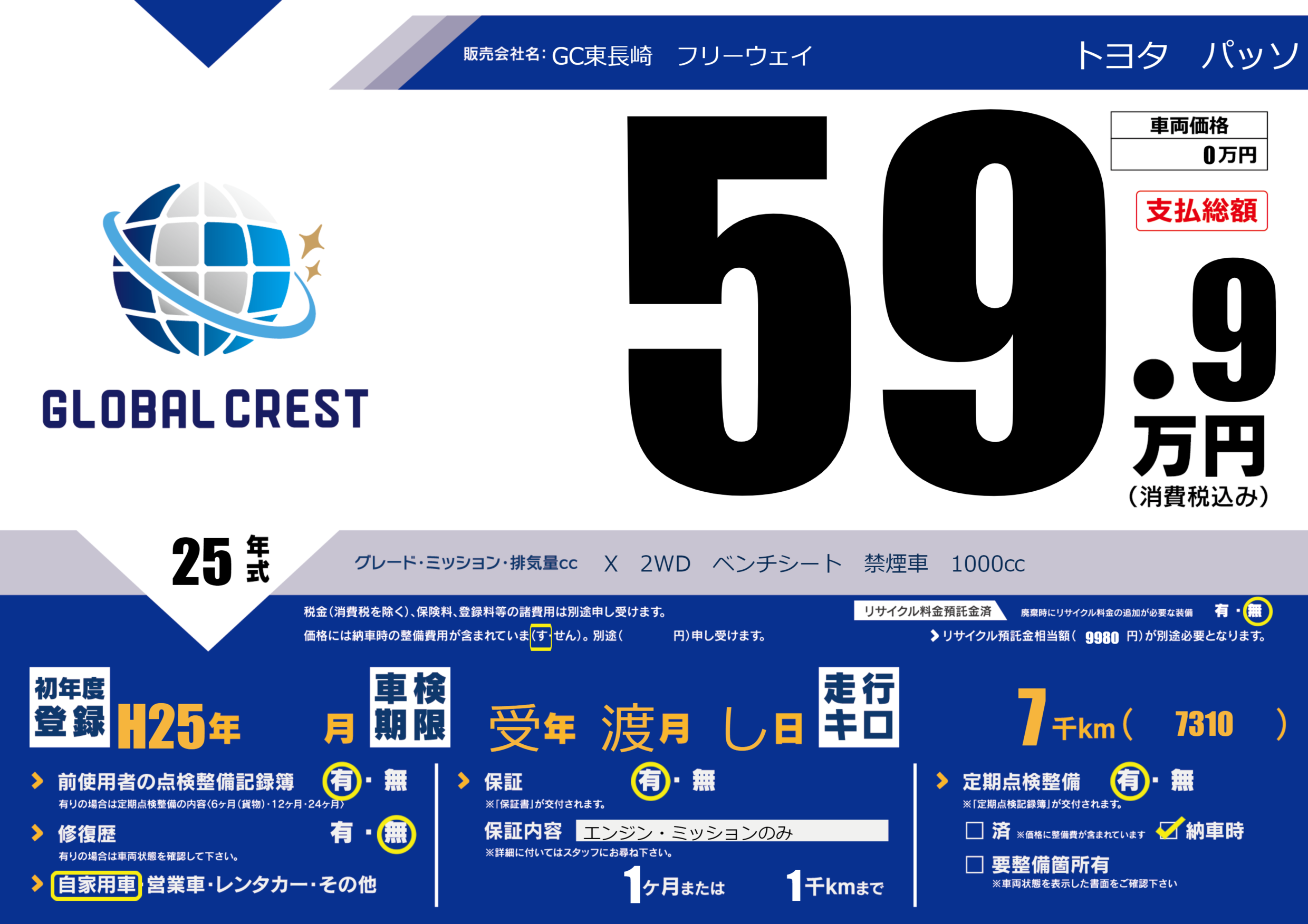 | 車名 | トヨタ パッソ | グレード ミッション 排気量 |