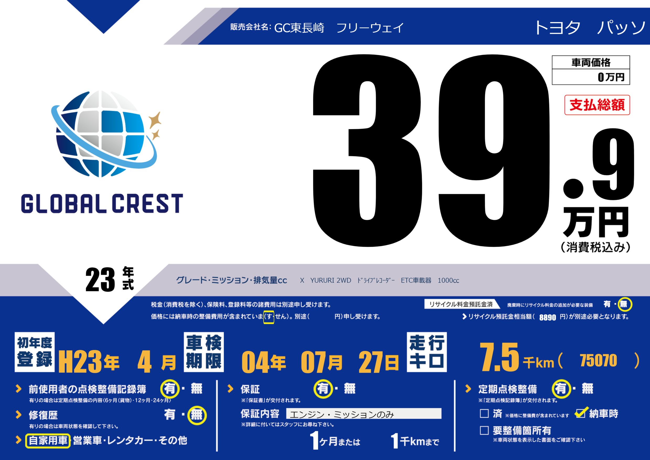 | 車名 | トヨタ パッソ | グレード ミッション 排気量 |