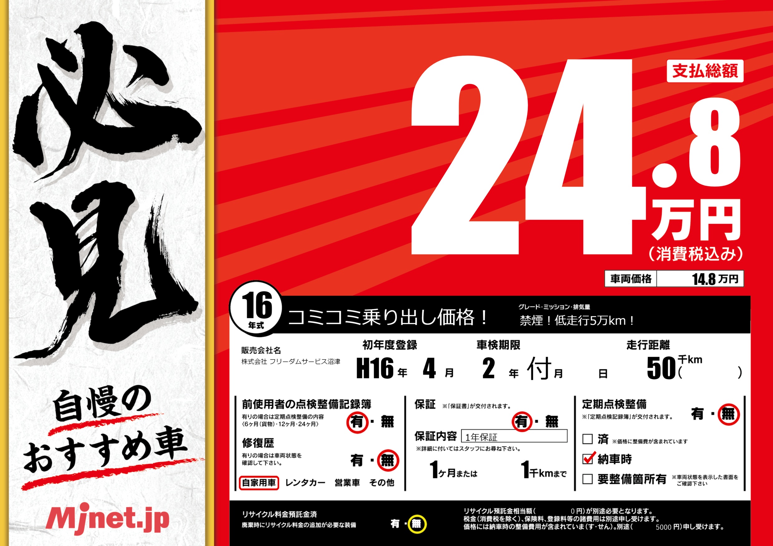 | 走行キロ | 5万km | 初年度登録 | H16年4月 |
