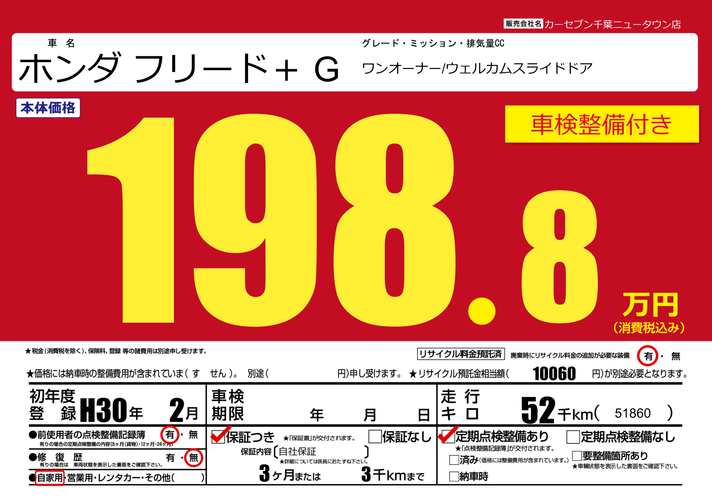| 車名 | ホンダ フリード+ G | グレード ミッション 排気量 |