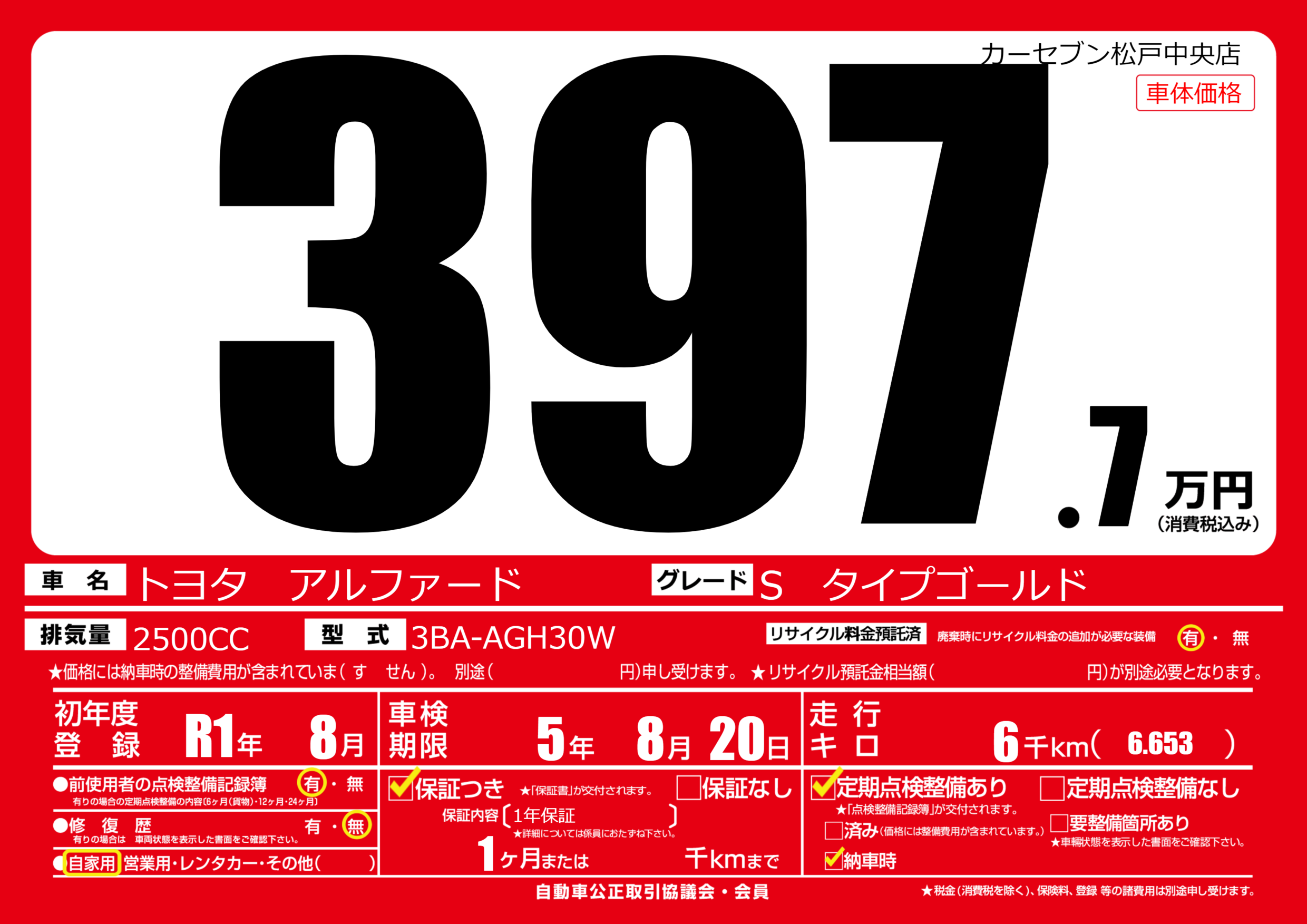 | 初年度登録 | R1年8月 | ||