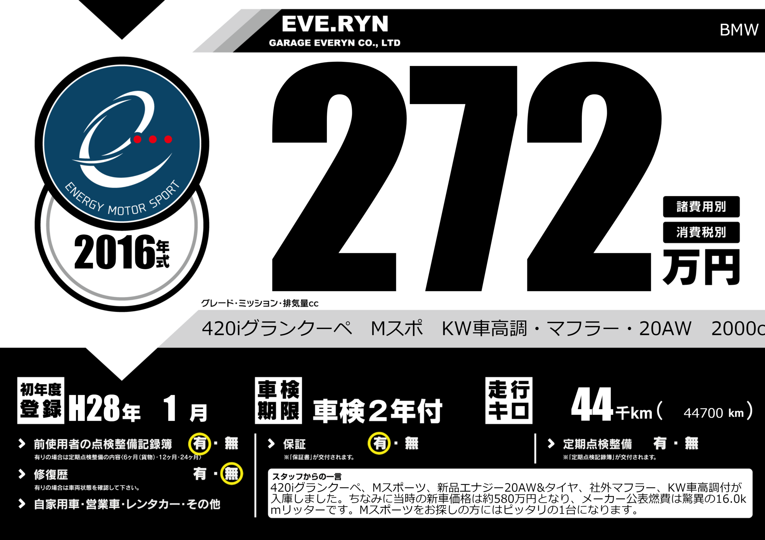 420iグランクーペ Mスポ KW車高調・マフラー・20AW 2000cc |