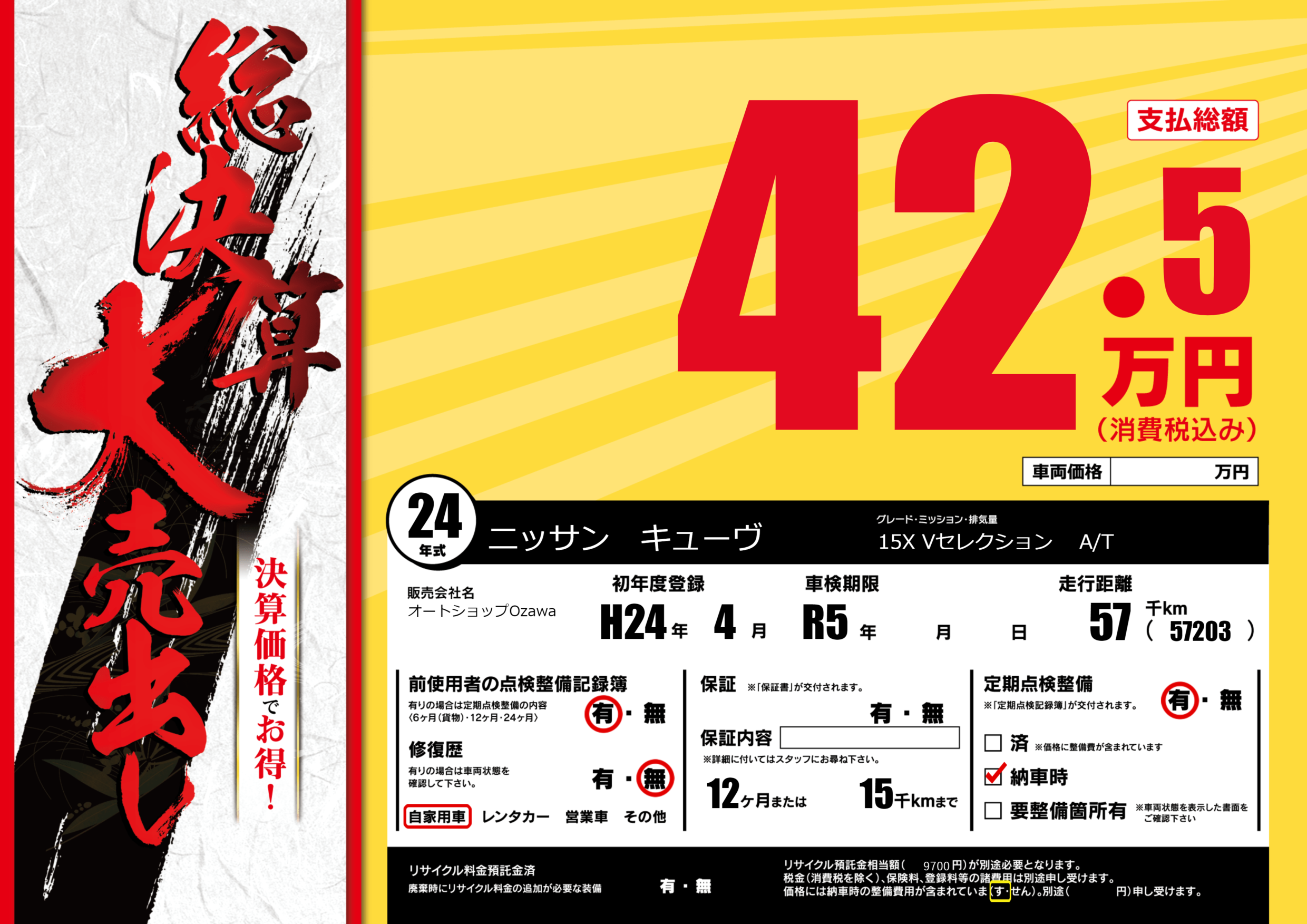 | 定期点検整備 | 定期点検整備あり 納車時あり | ||