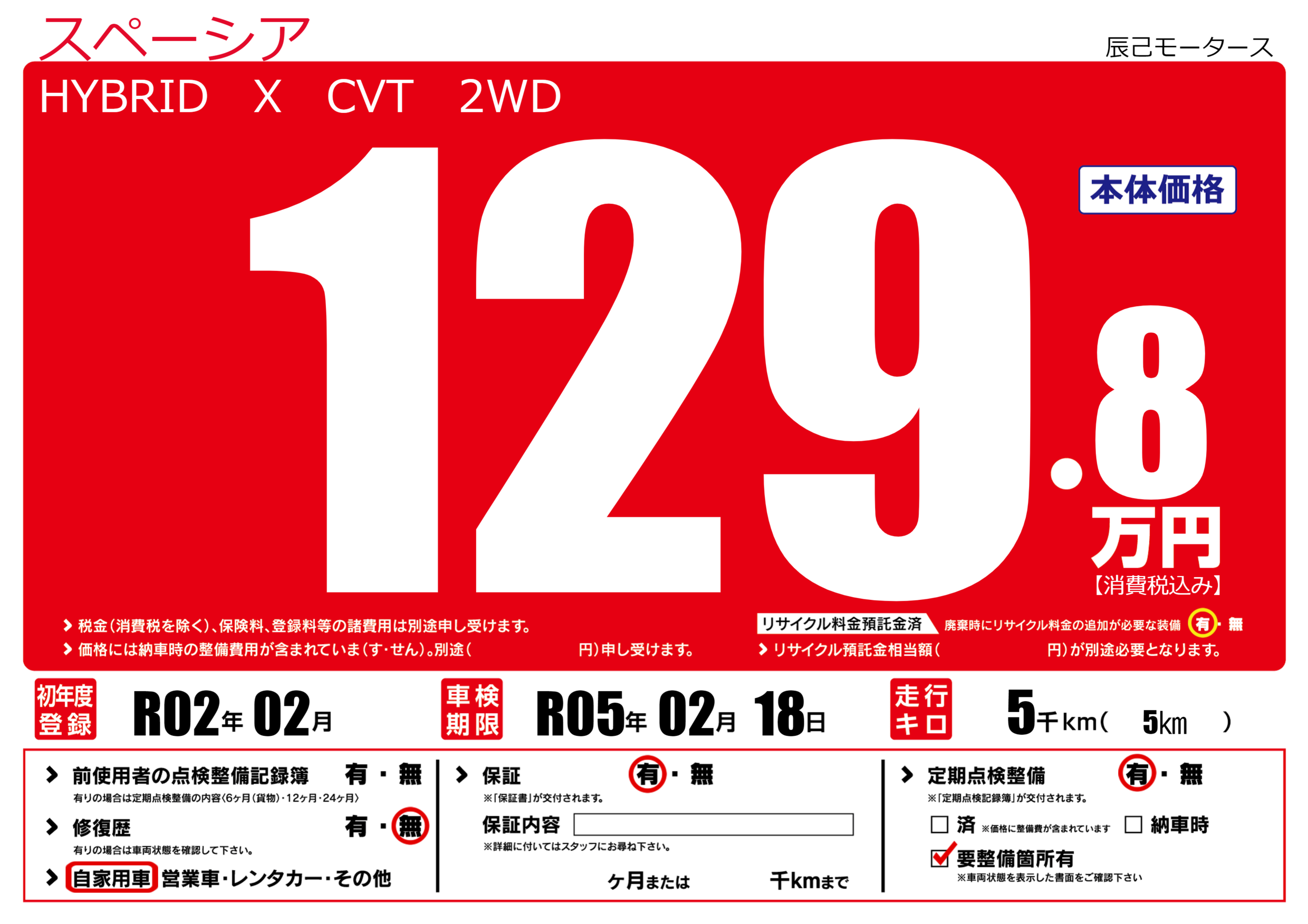 | 走行キロ | 0.5万km | 初年度登録 | R02年02月 |