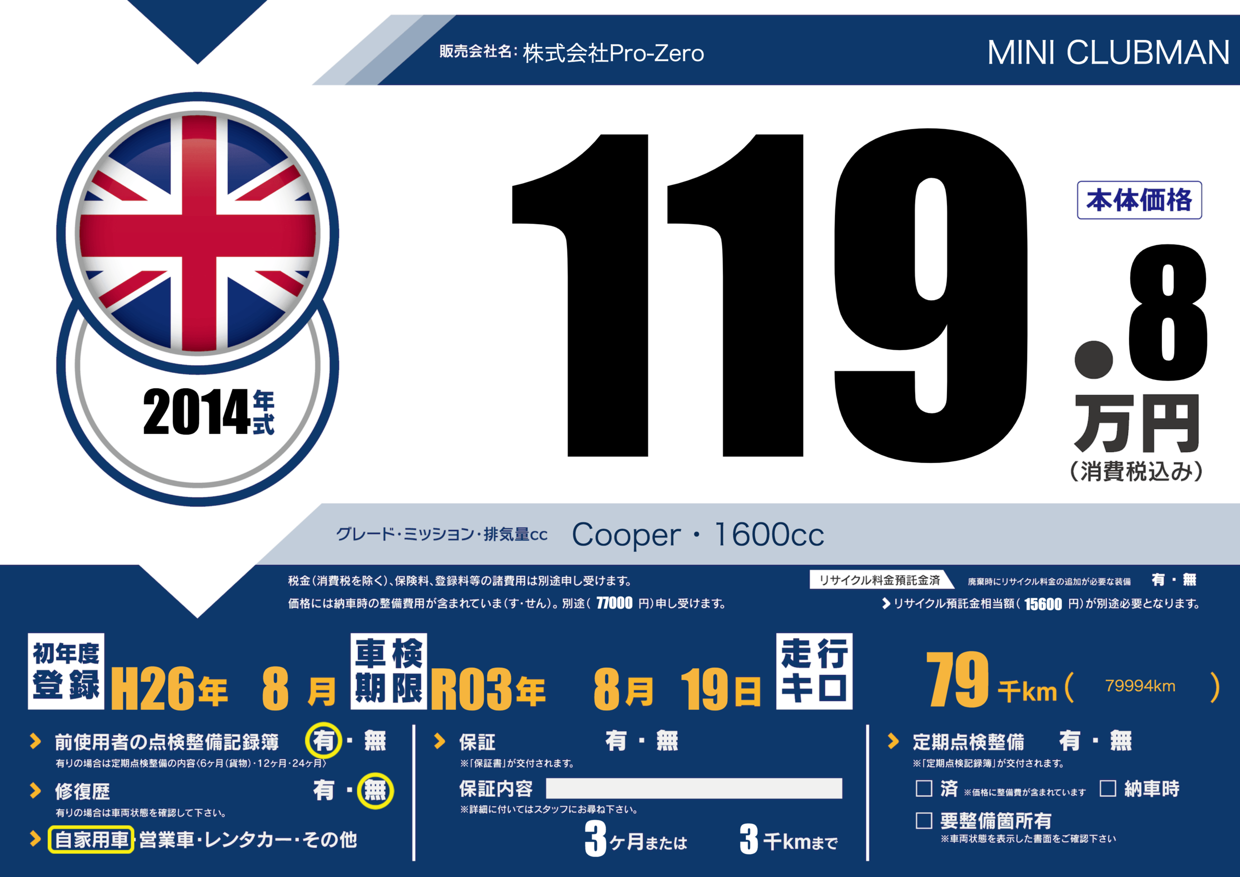 | 車名 | MINI CLUBMAN | グレード ミッション 排気量 |
