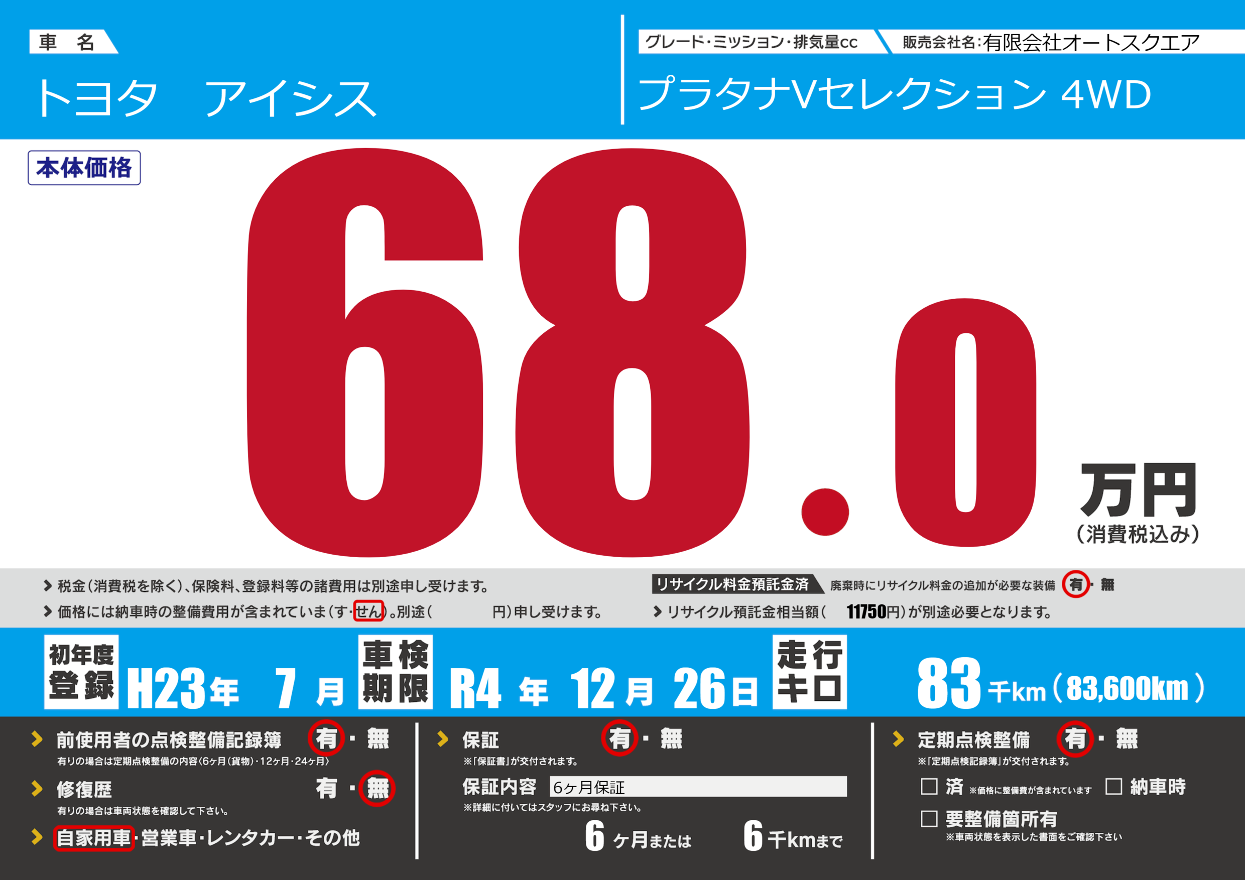 | 車名 | トヨタ アイシス | グレード ミッション 排気量 |