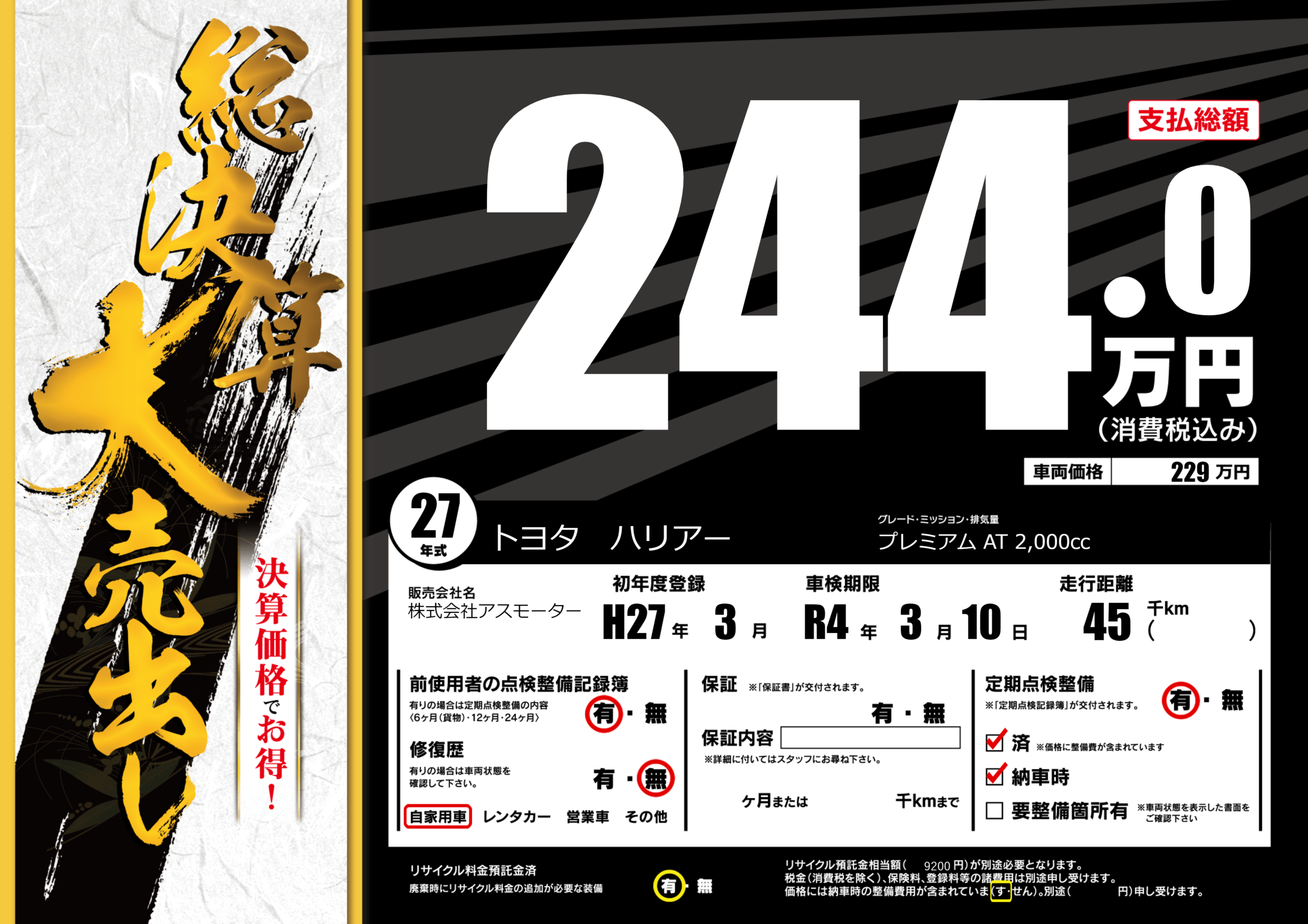 | 走行キロ | 4.5万km | 初年度登録 | H27年3月 |