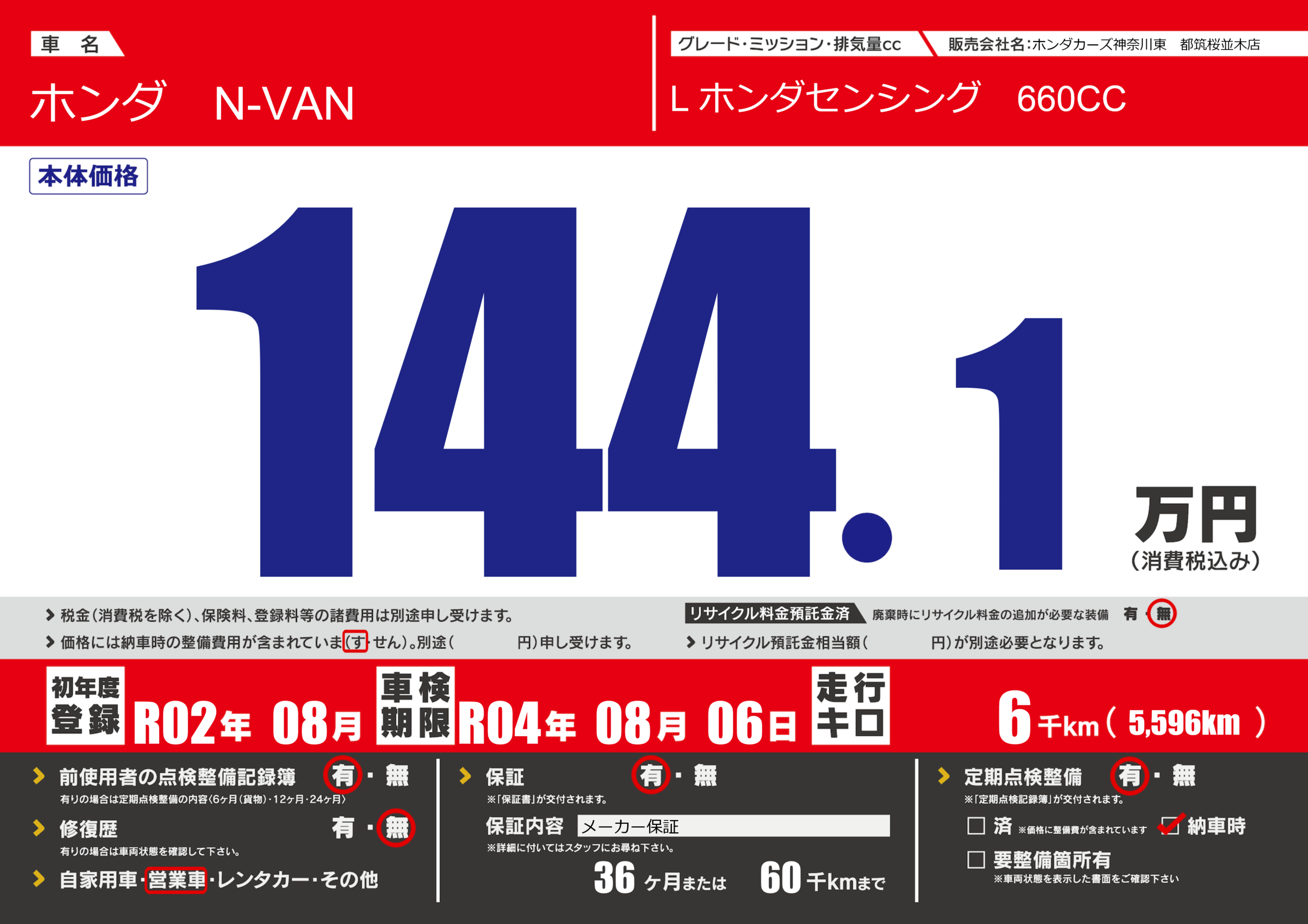 | 車名 | ホンダ N-VAN | グレード ミッション 排気量 |