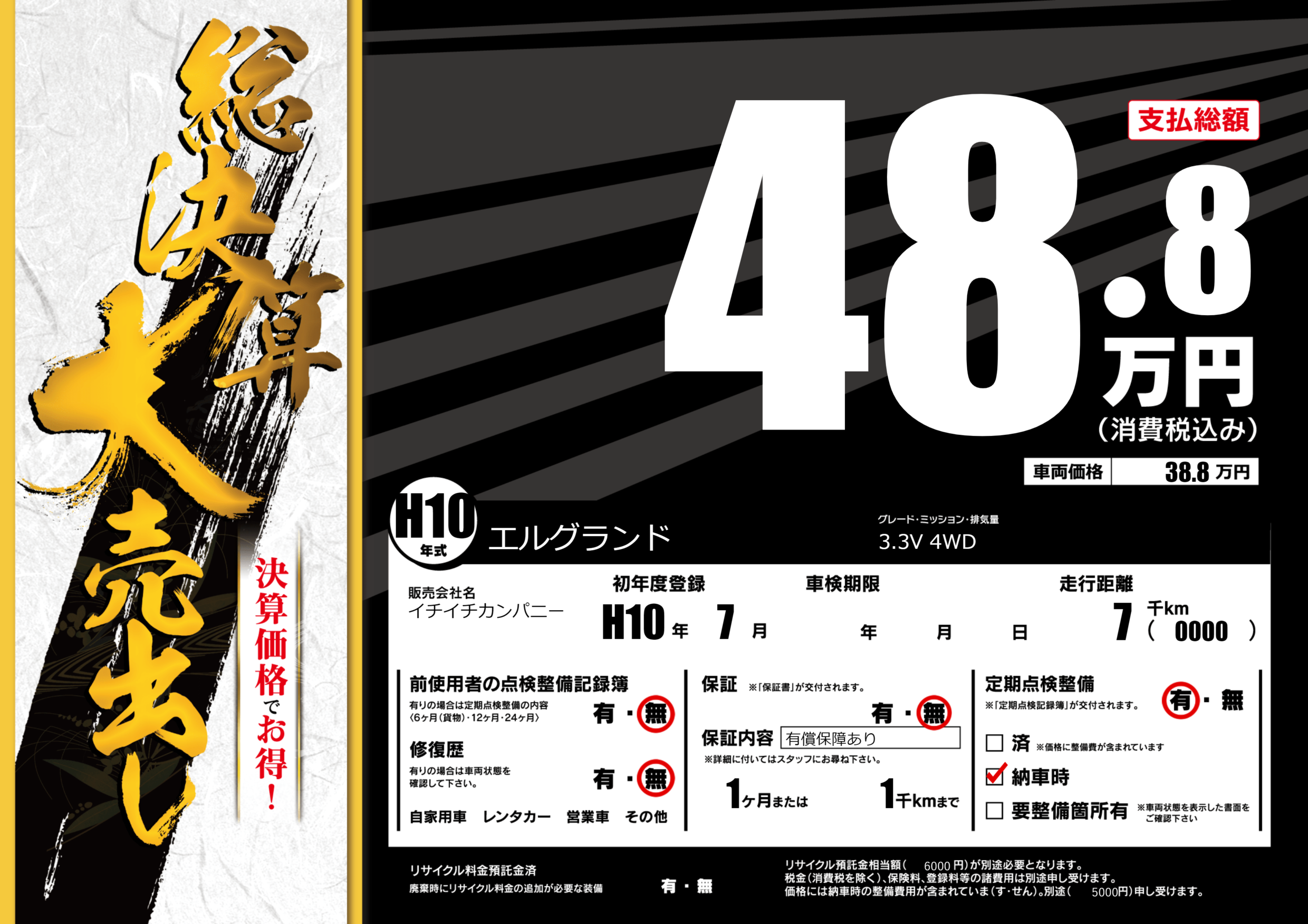 | 定期点検整備 | 定期点検整備あり 納車時あり | ||