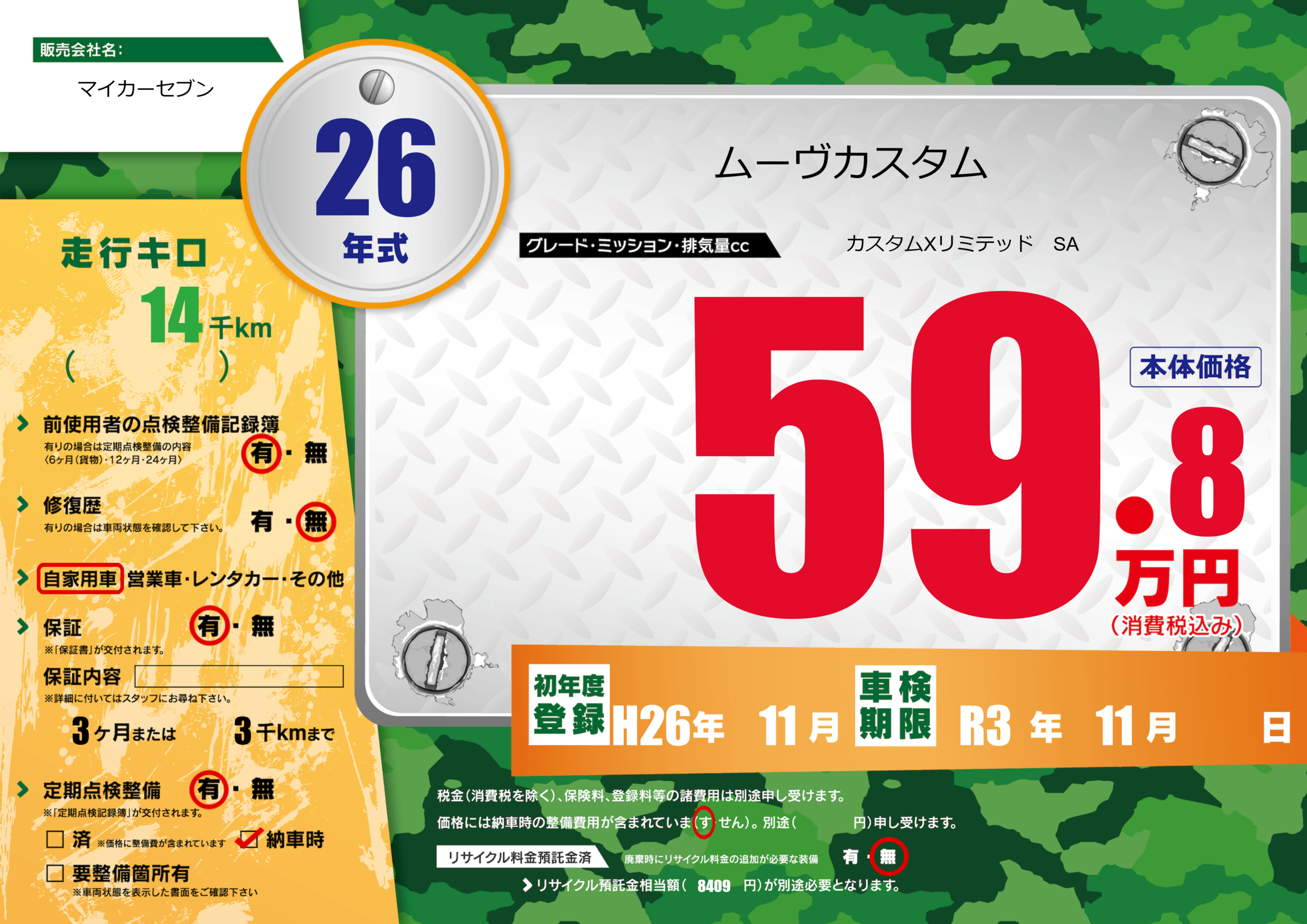 | 車検制限 | R3年 11月 - 日 | ||
