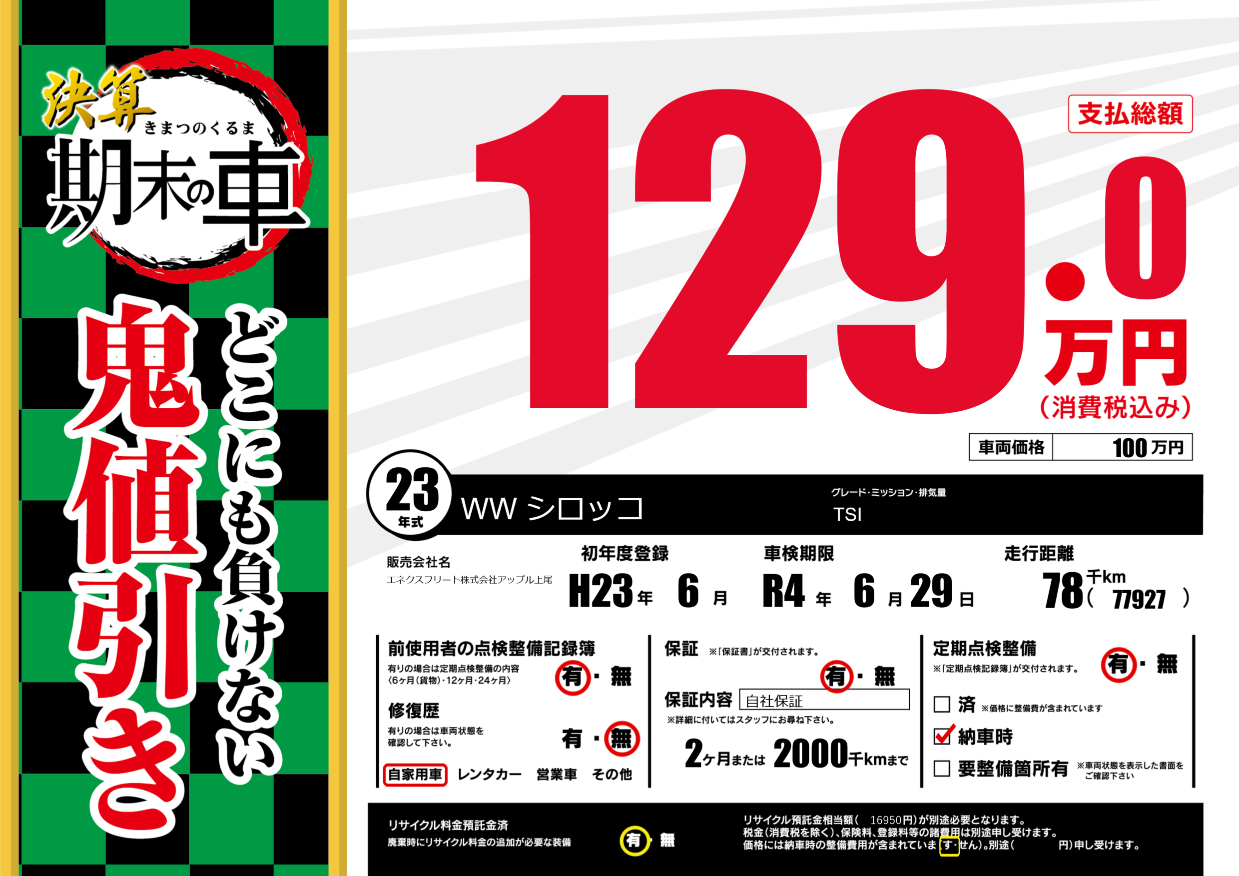 保証付き 保証内容(自社保証) 2ヶ月または(2000)千kmまで |