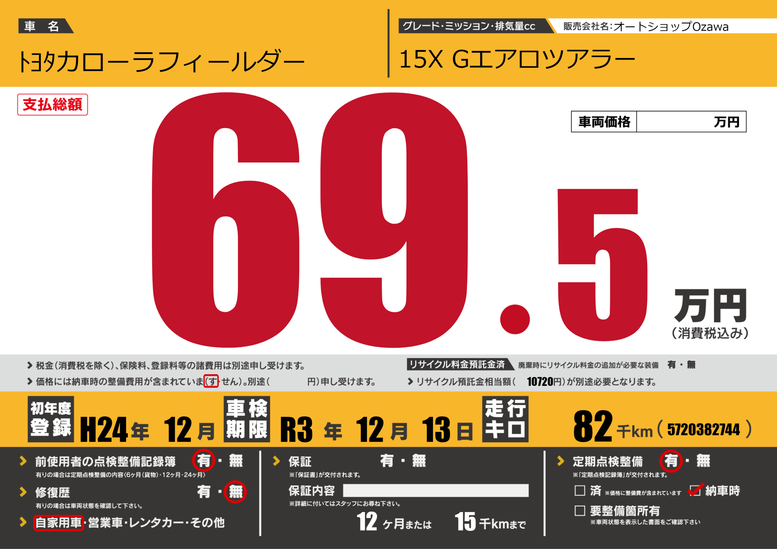 | 定期点検整備 | 定期点検整備あり 納車時あり | ||