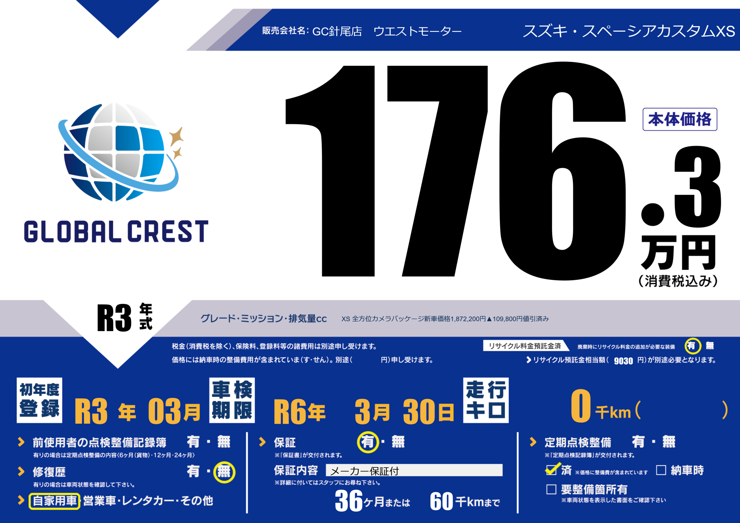 | 車名 | スズキ・スペーシアカスタムXS | グレード ミッション 排気量 |