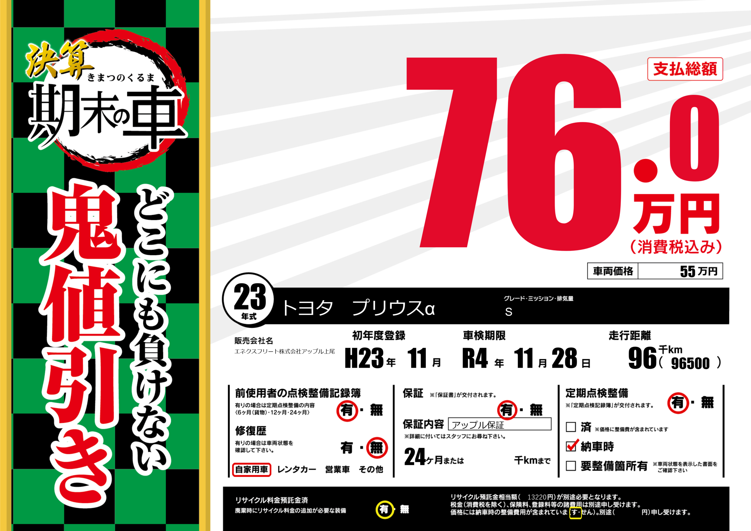 | 車名 | トヨタ プリウスα | グレード ミッション 排気量 |
