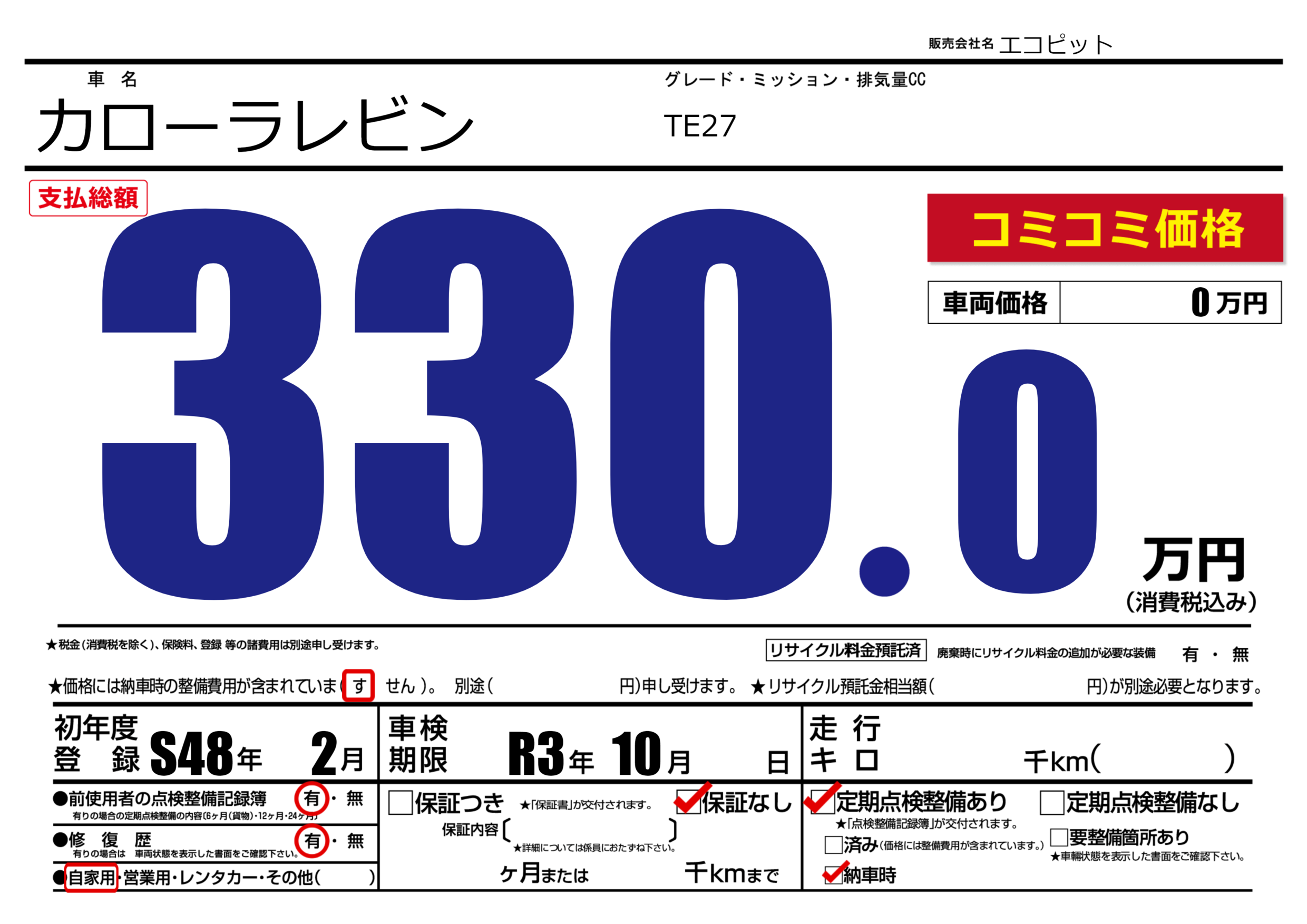 | 車名 | カローラレビン | グレード ミッション 排気量 |