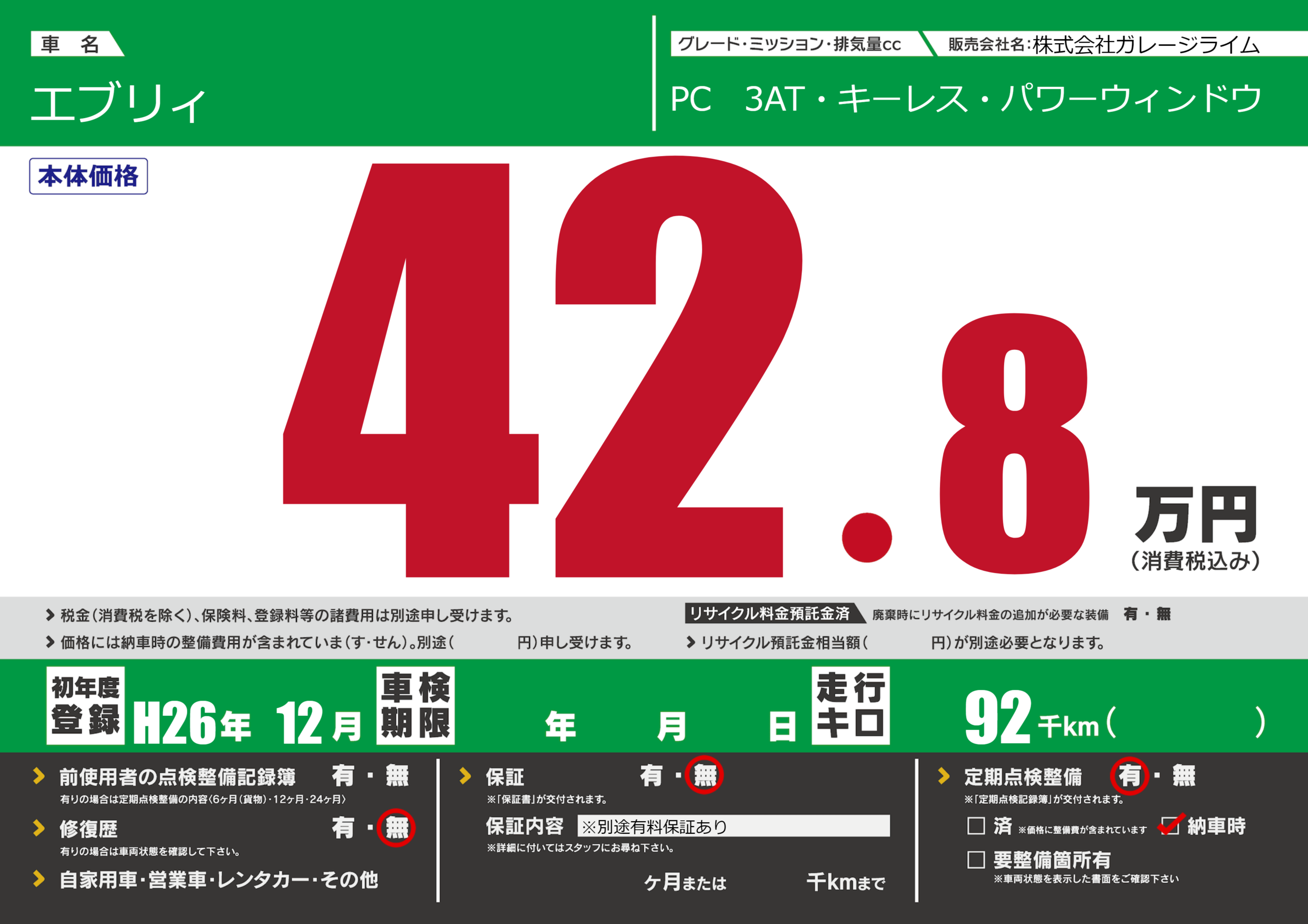 保証なし 保証内容(※別途有料保証あり) ---ヶ月または()千kmまで |