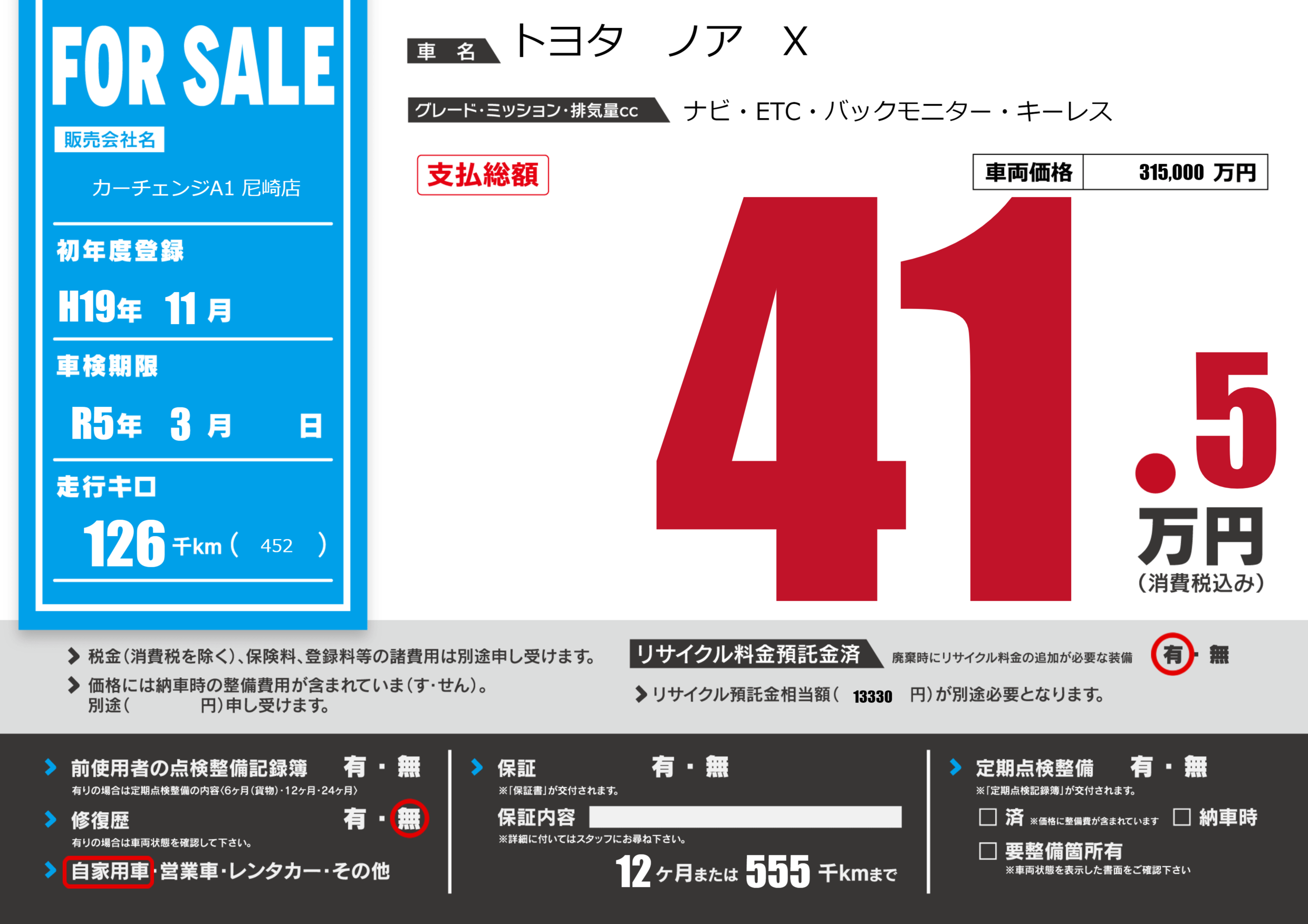 | 車名 | トヨタ ノア X | グレード ミッション 排気量 |