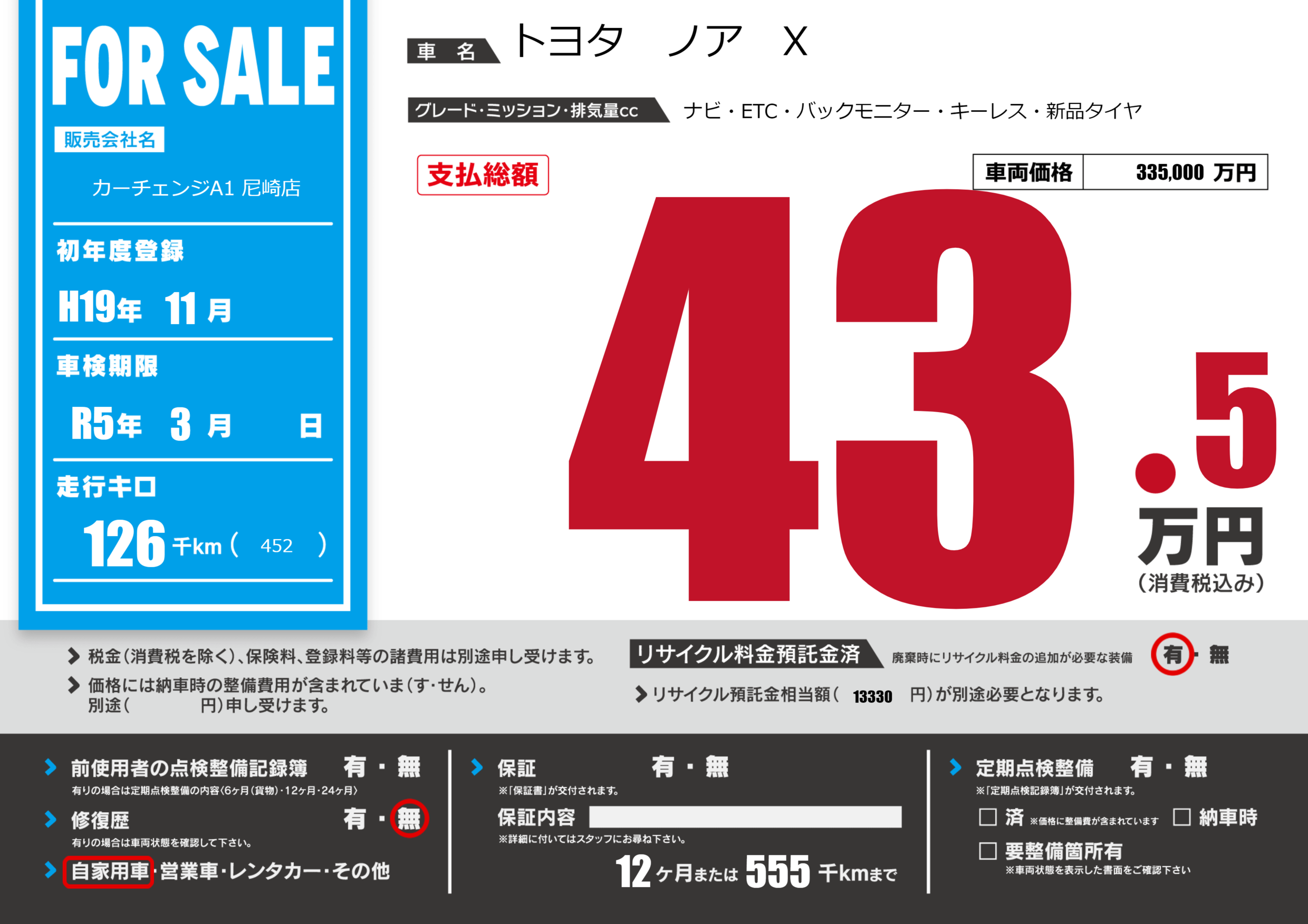なし | 車検制限 | R5年3月---月 |