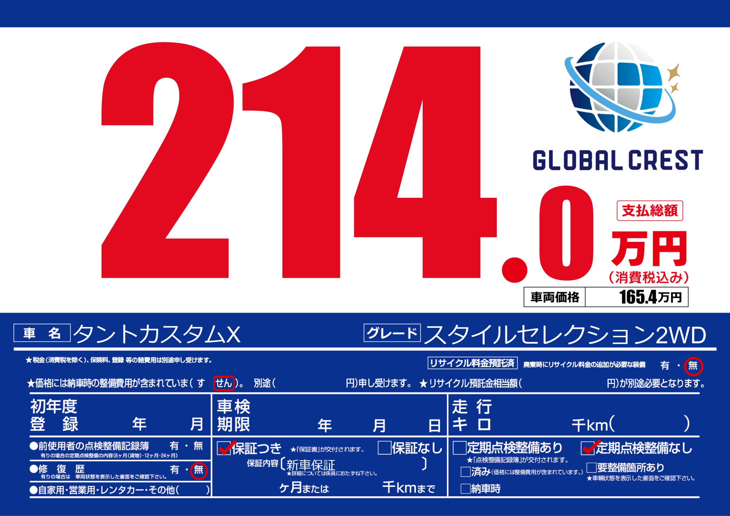 | 車名 | タントカスタムX | グレード ミッション 排気量 |
