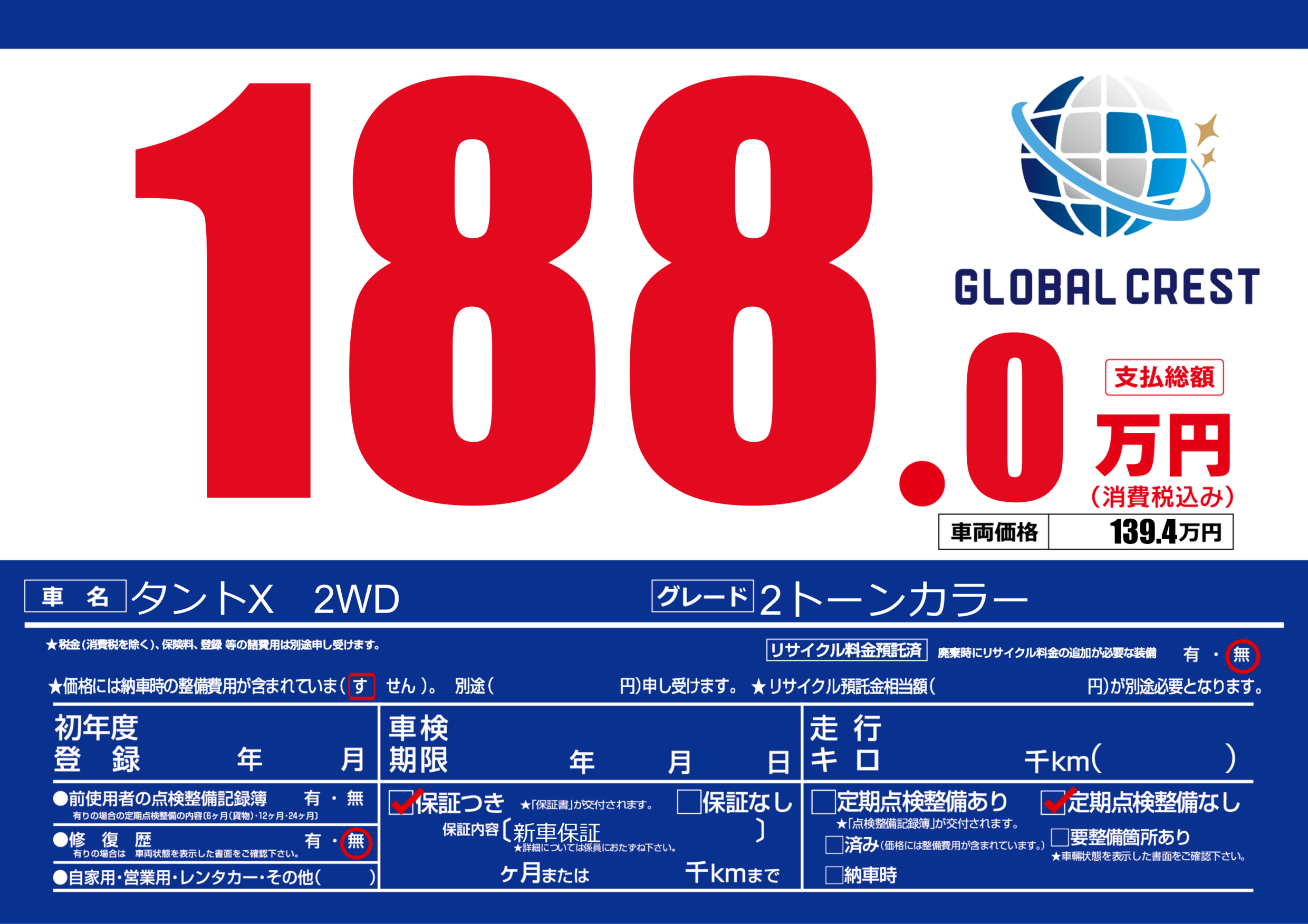 | 車名 | タントX 2WD | グレード ミッション 排気量 |