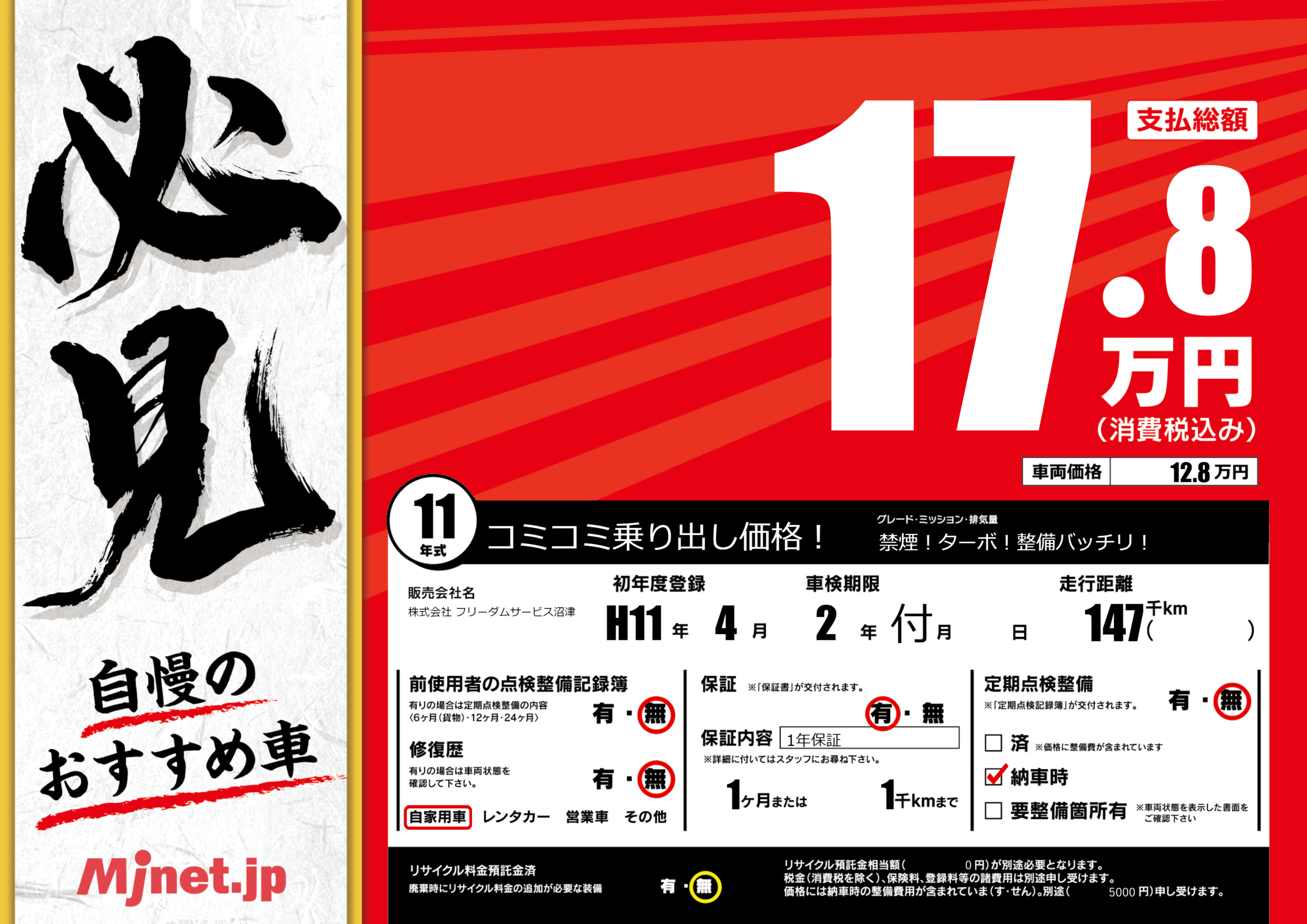 | 走行キロ | 14.7万km | 初年度登録 | H11年4月 |