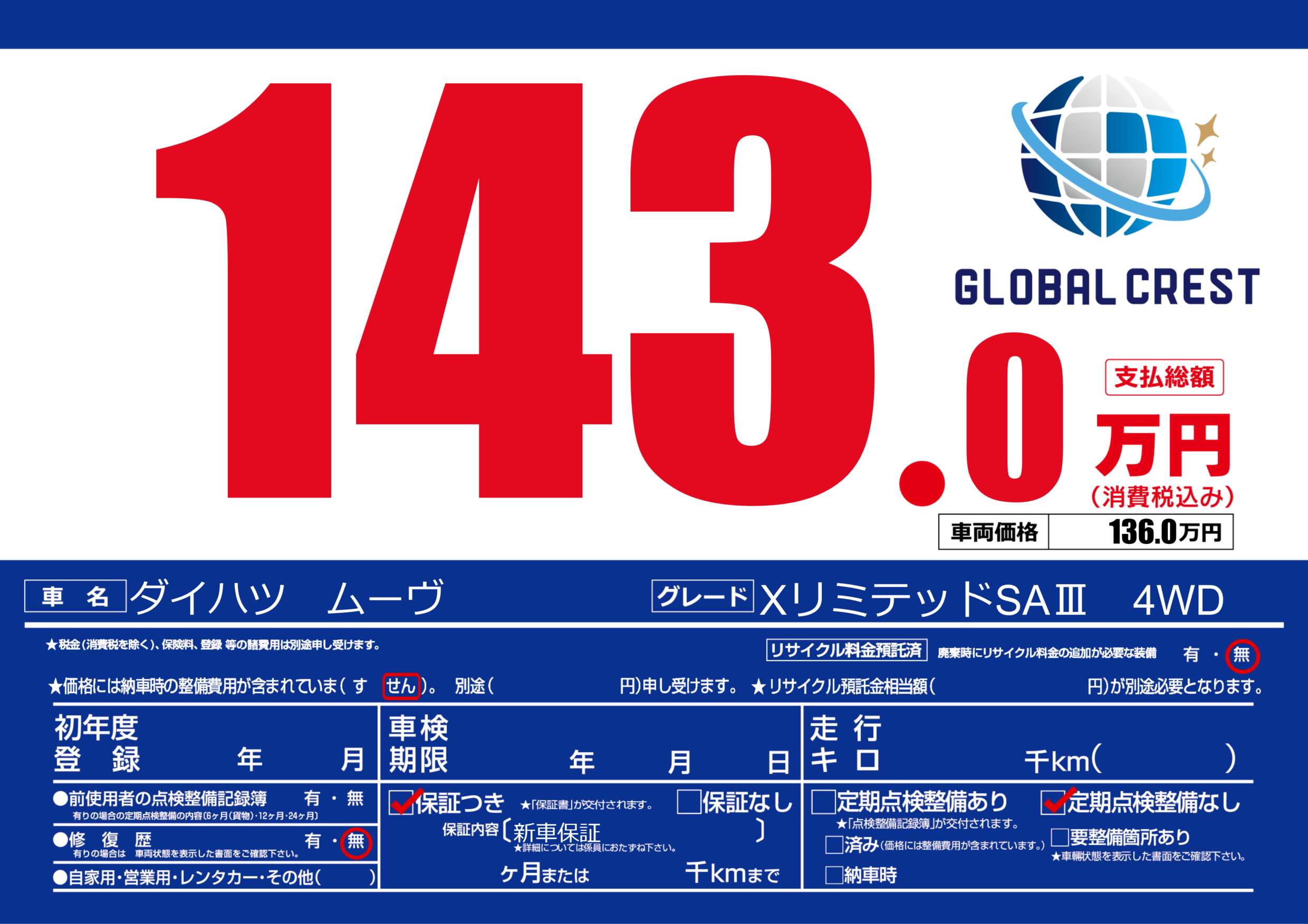 | 車名 | ダイハツ ムーヴ | グレード ミッション 排気量 |