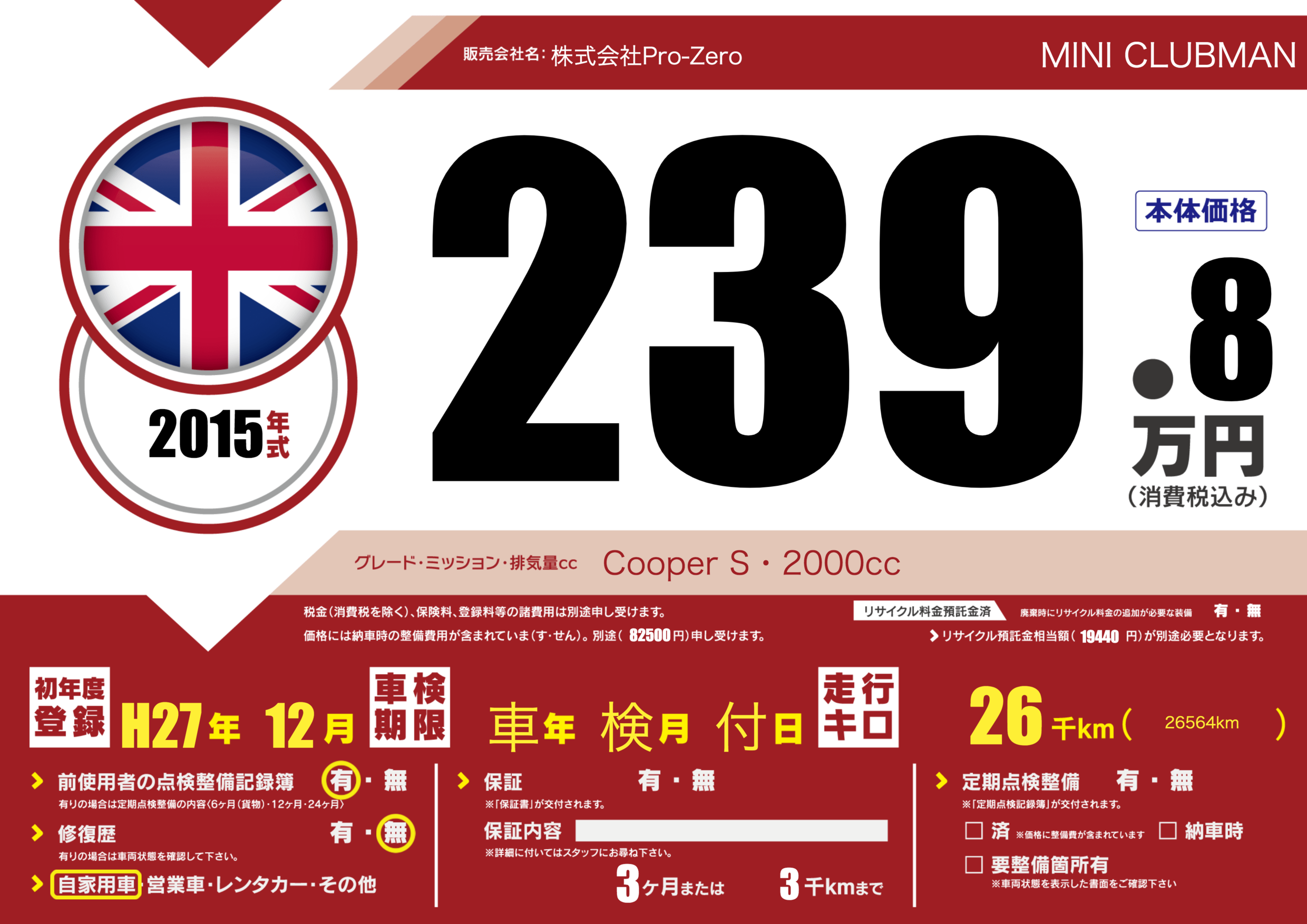 | 車名 | MINI CLUBMAN | グレード ミッション 排気量 |