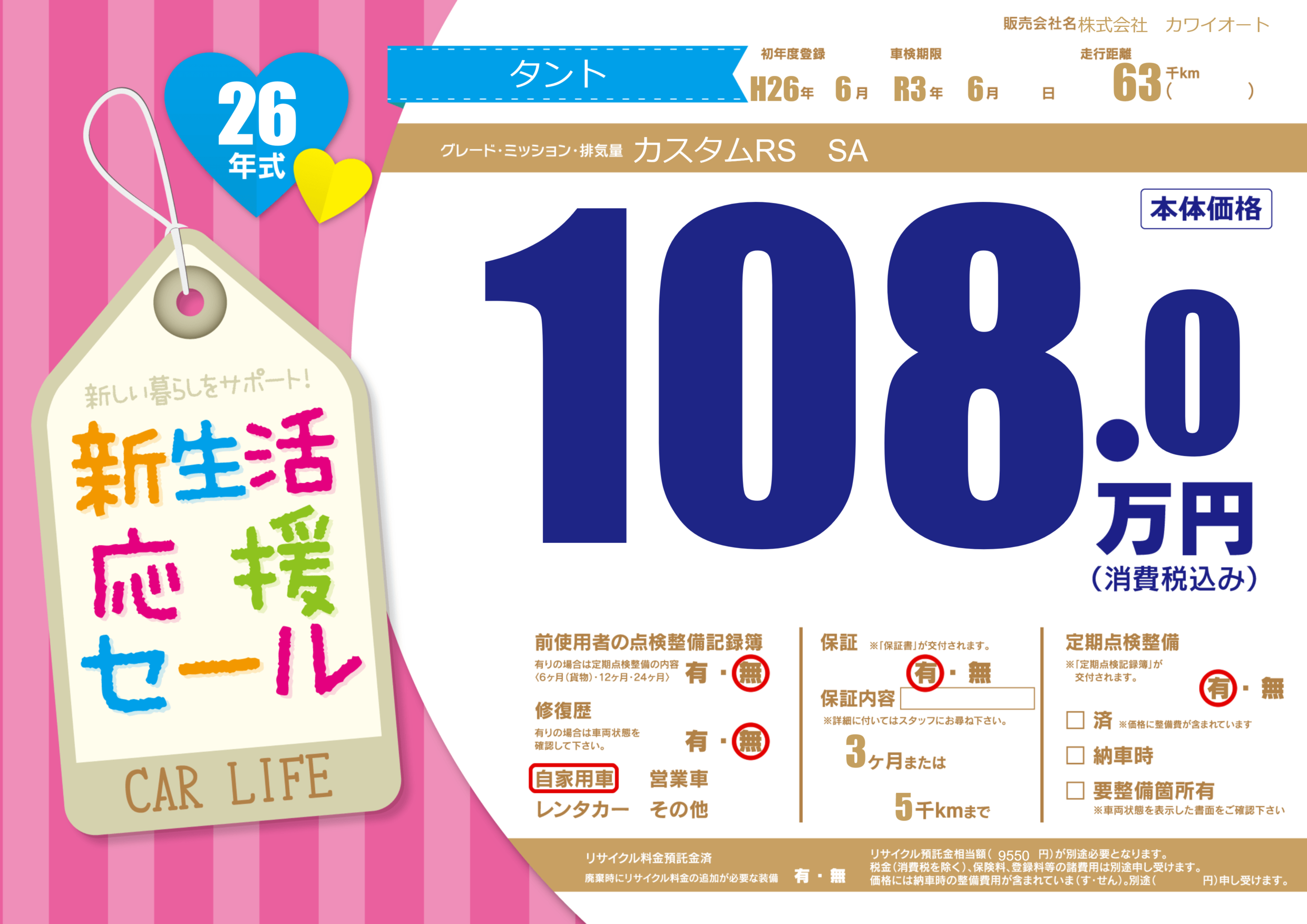 保証付き 保証内容(---) 3ヶ月または(5)千kmまで |
