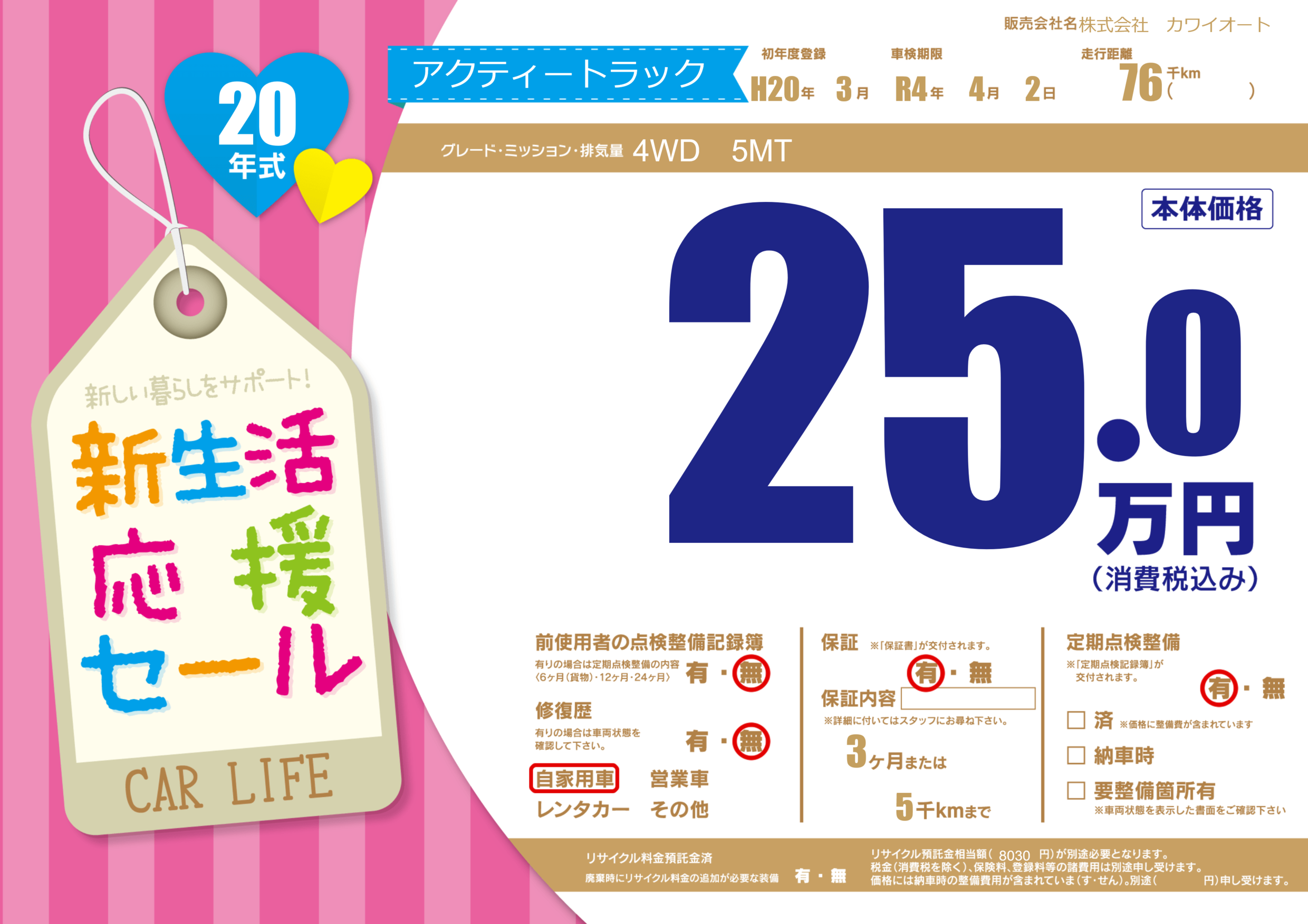 保証付き 保証内容(---) 3ヶ月または(5)千kmまで |