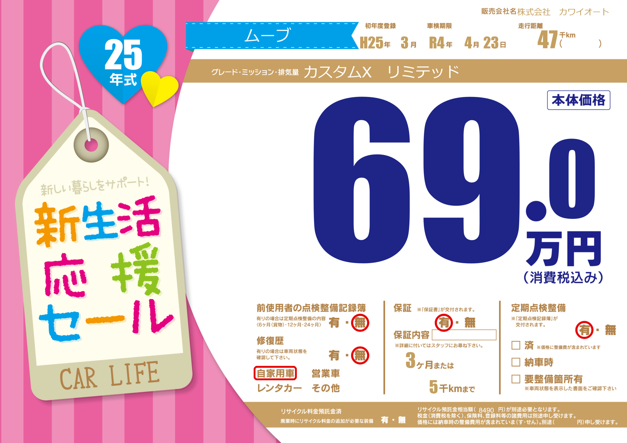 保証付き 保証内容(---) 3ヶ月または(5)千kmまで |