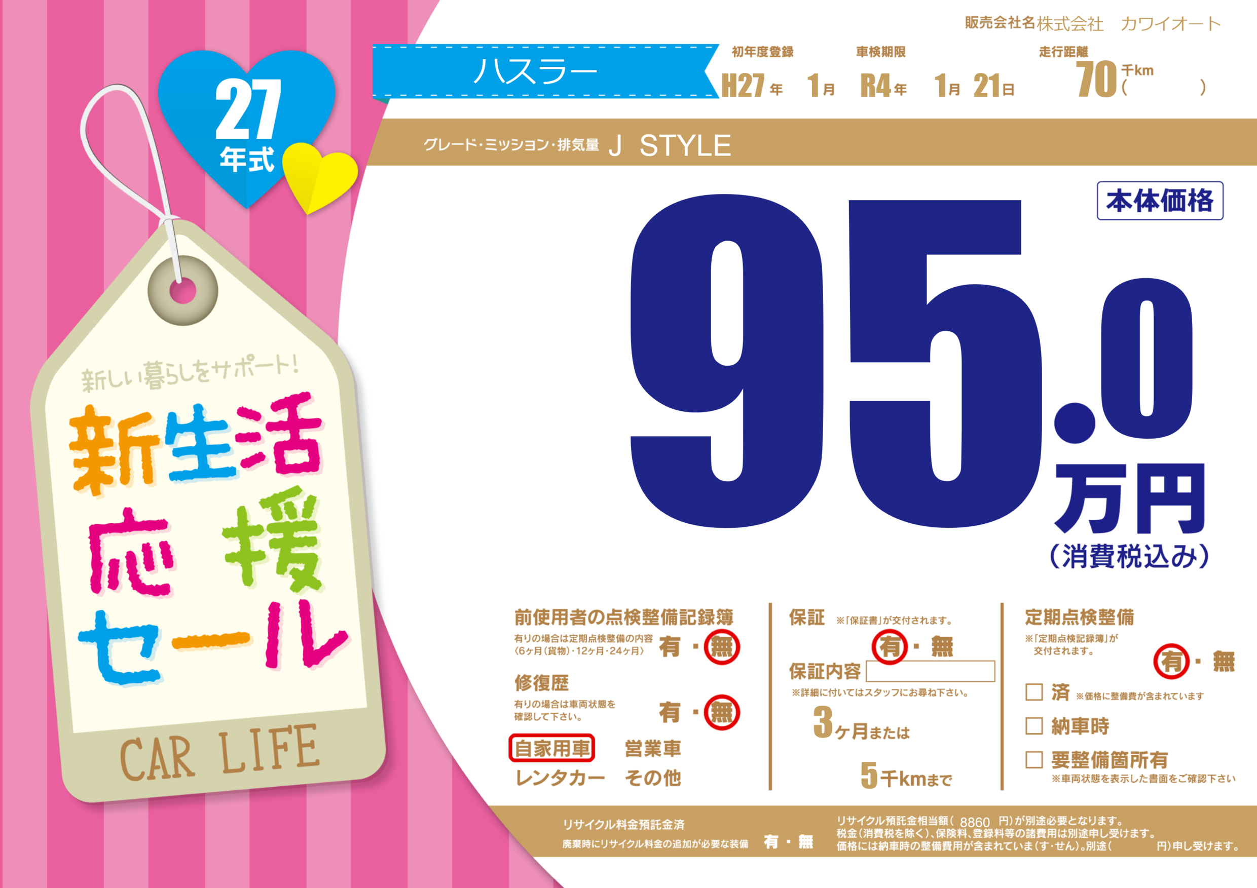 保証付き 保証内容(---) 3ヶ月または(5)千kmまで |