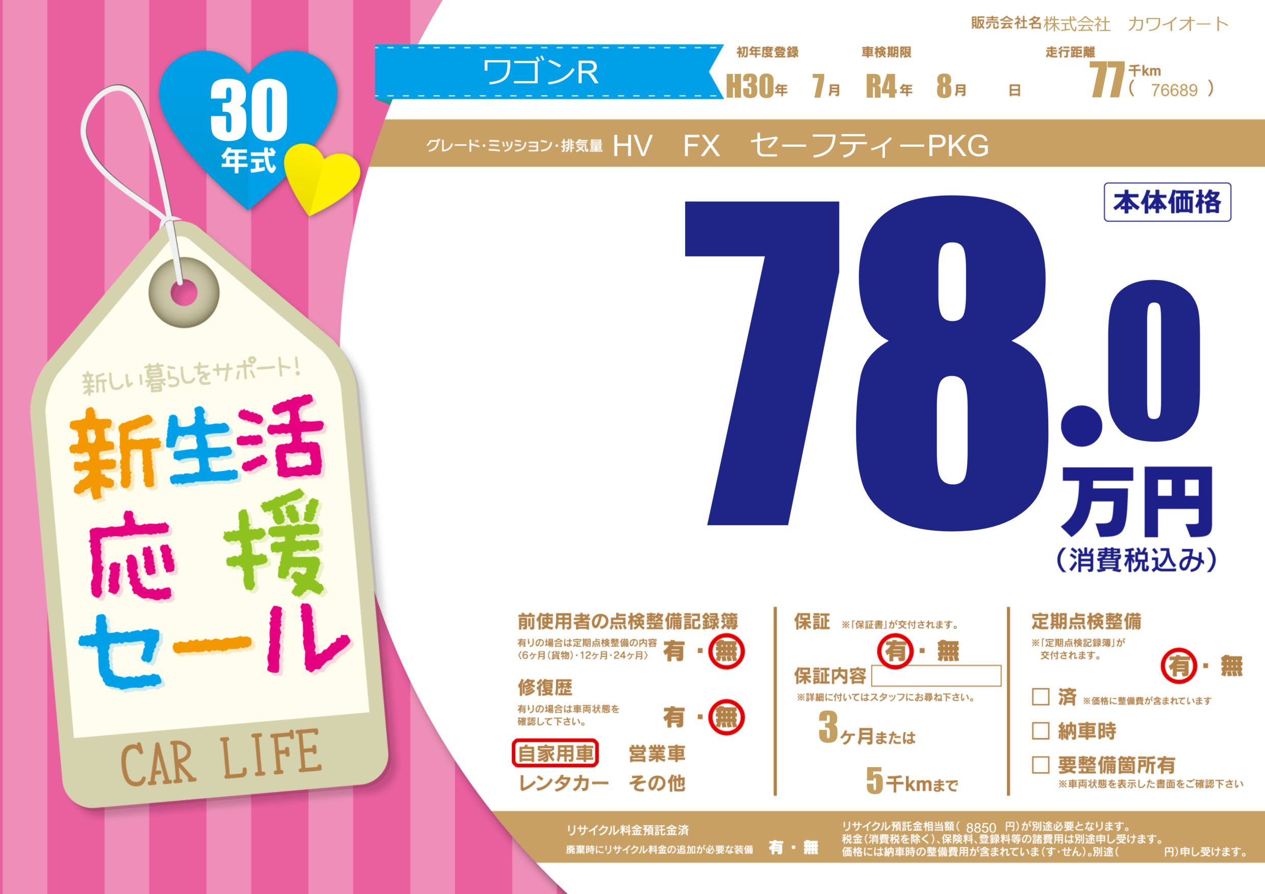 | 車名 | ワゴンR | グレード ミッション 排気量 |