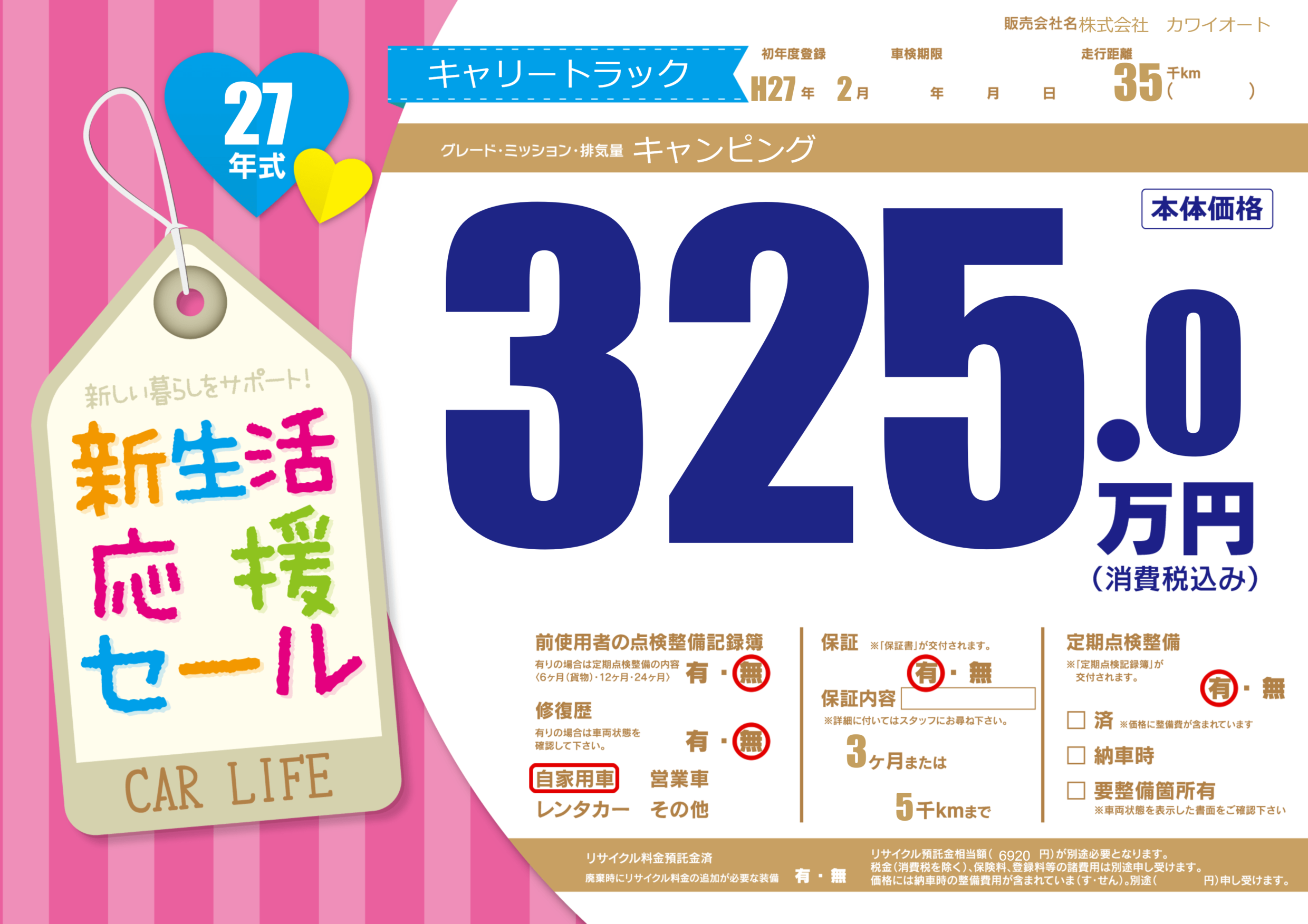 保証付き 保証内容(---) 3ヶ月または(5)千kmまで |