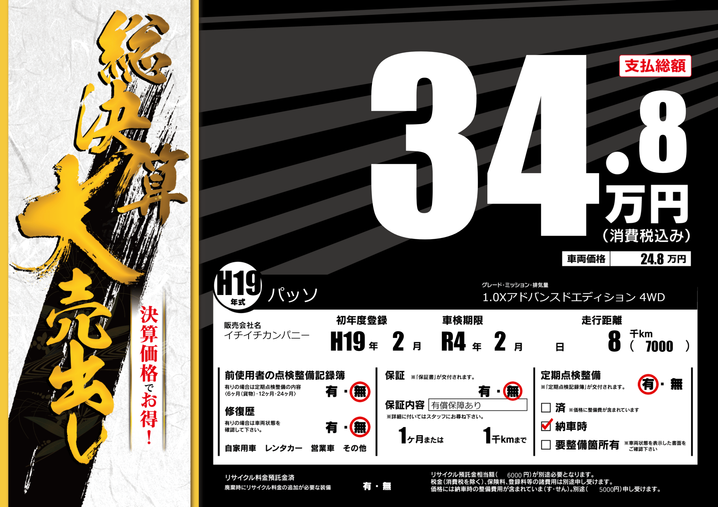 | 車名 | パッソ | グレード ミッション 排気量 |