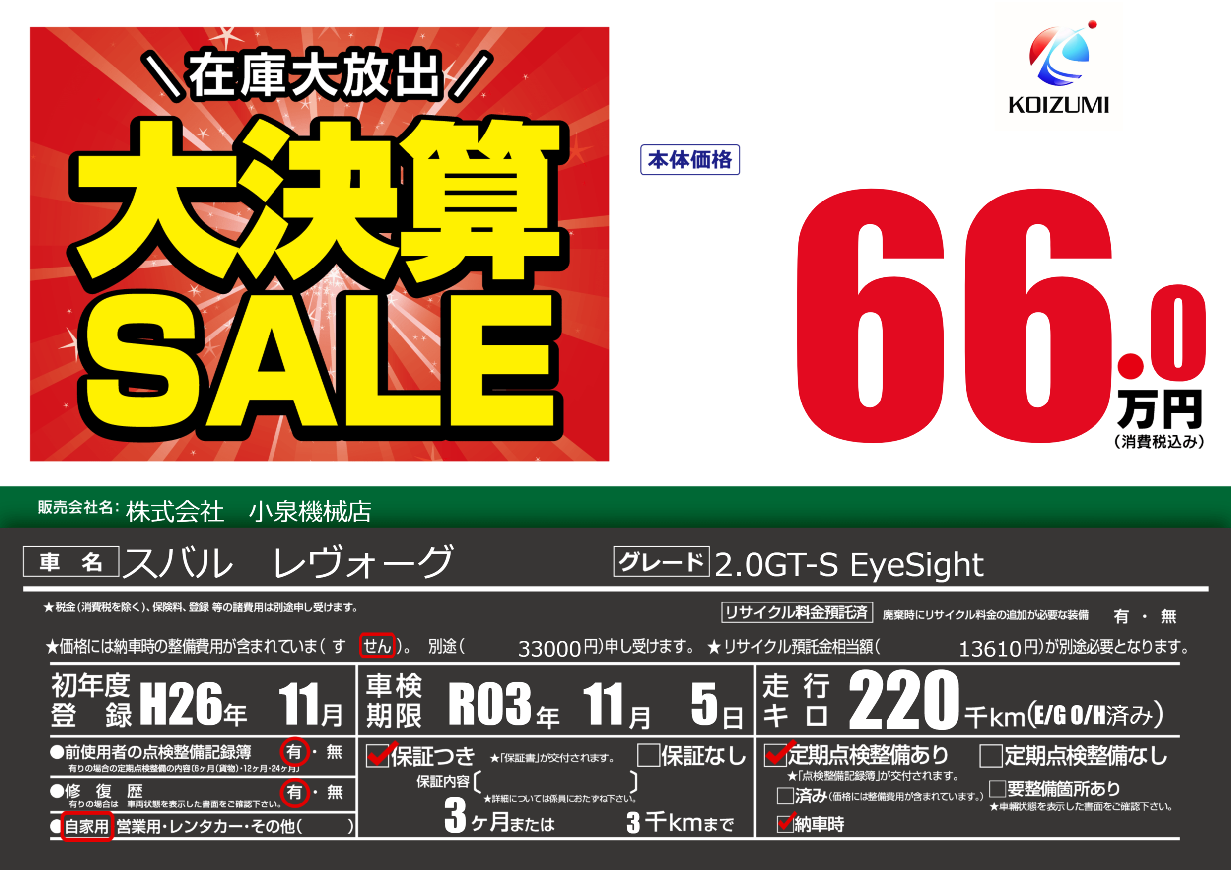 | 車名 | スバル レヴォーグ | グレード ミッション 排気量 |