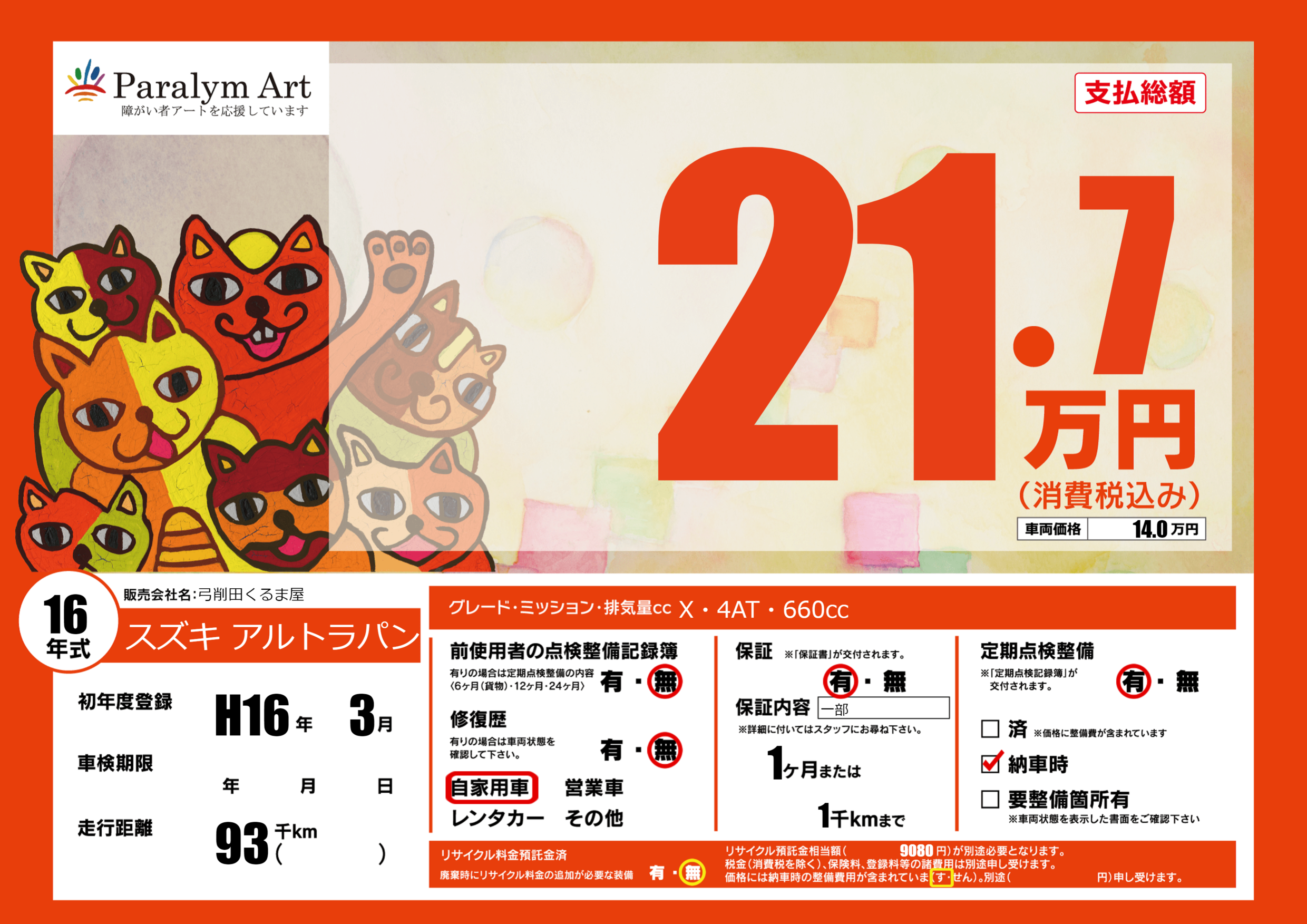 | 走行キロ | 9.3万km | 初年度登録 | H16年3月 |