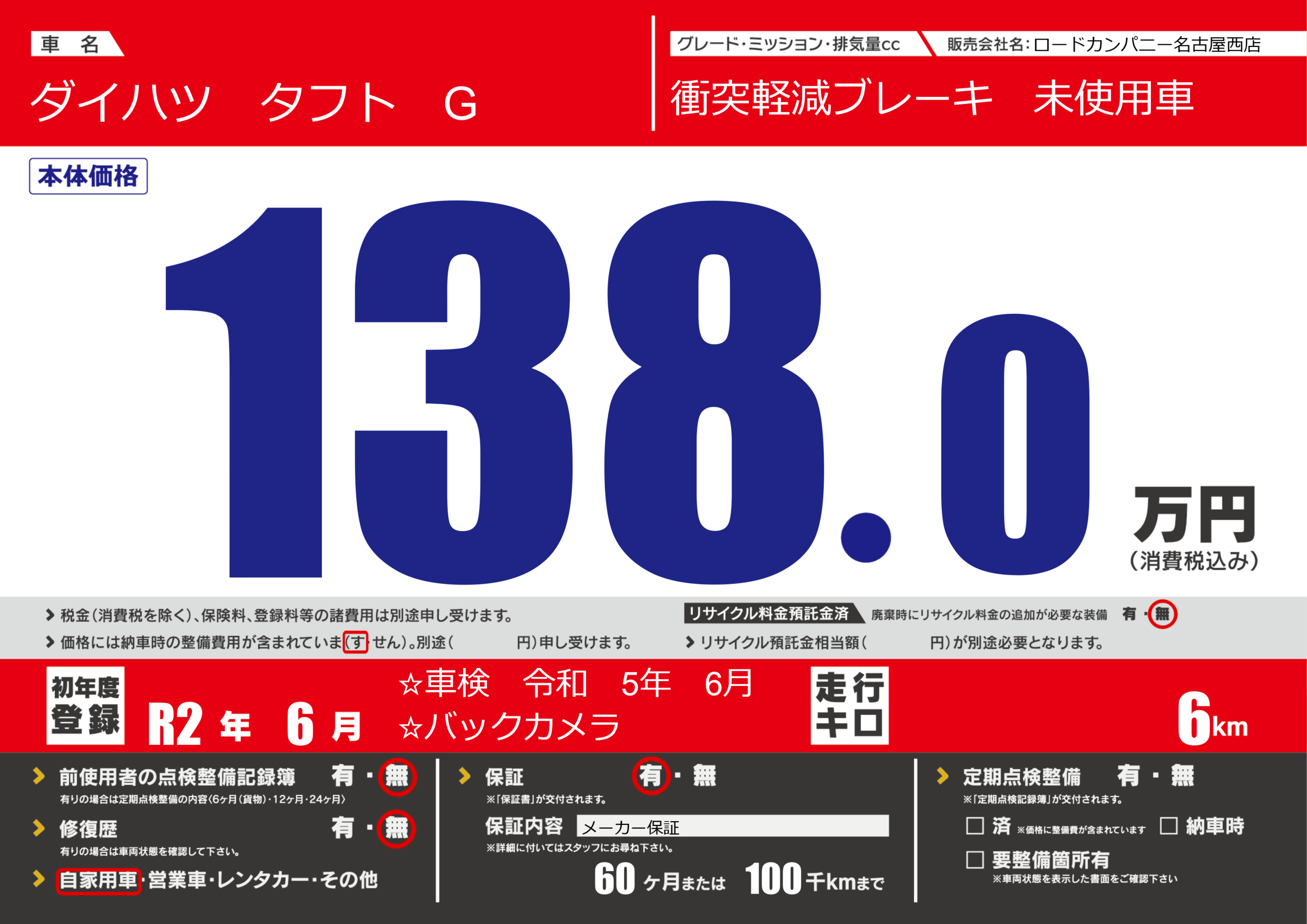 | 走行キロ | 0.6万km | 初年度登録 | R2年6月 |