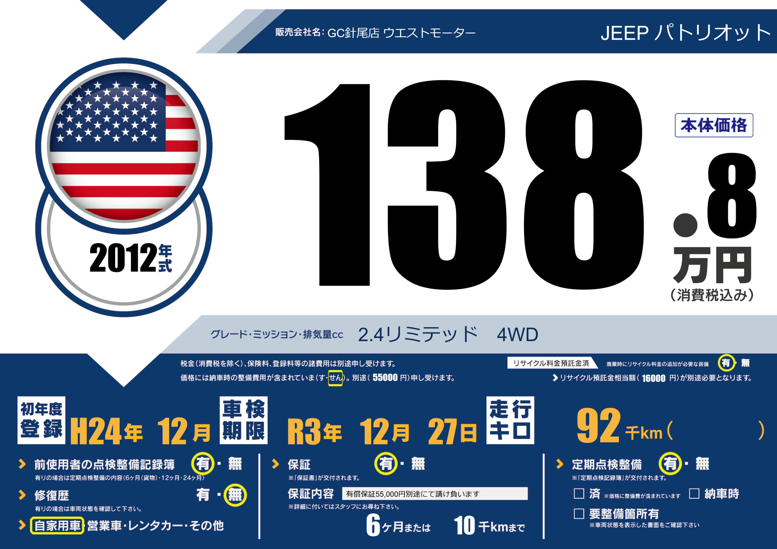 | 車名 | JEEP パトリオット | グレード ミッション 排気量 |