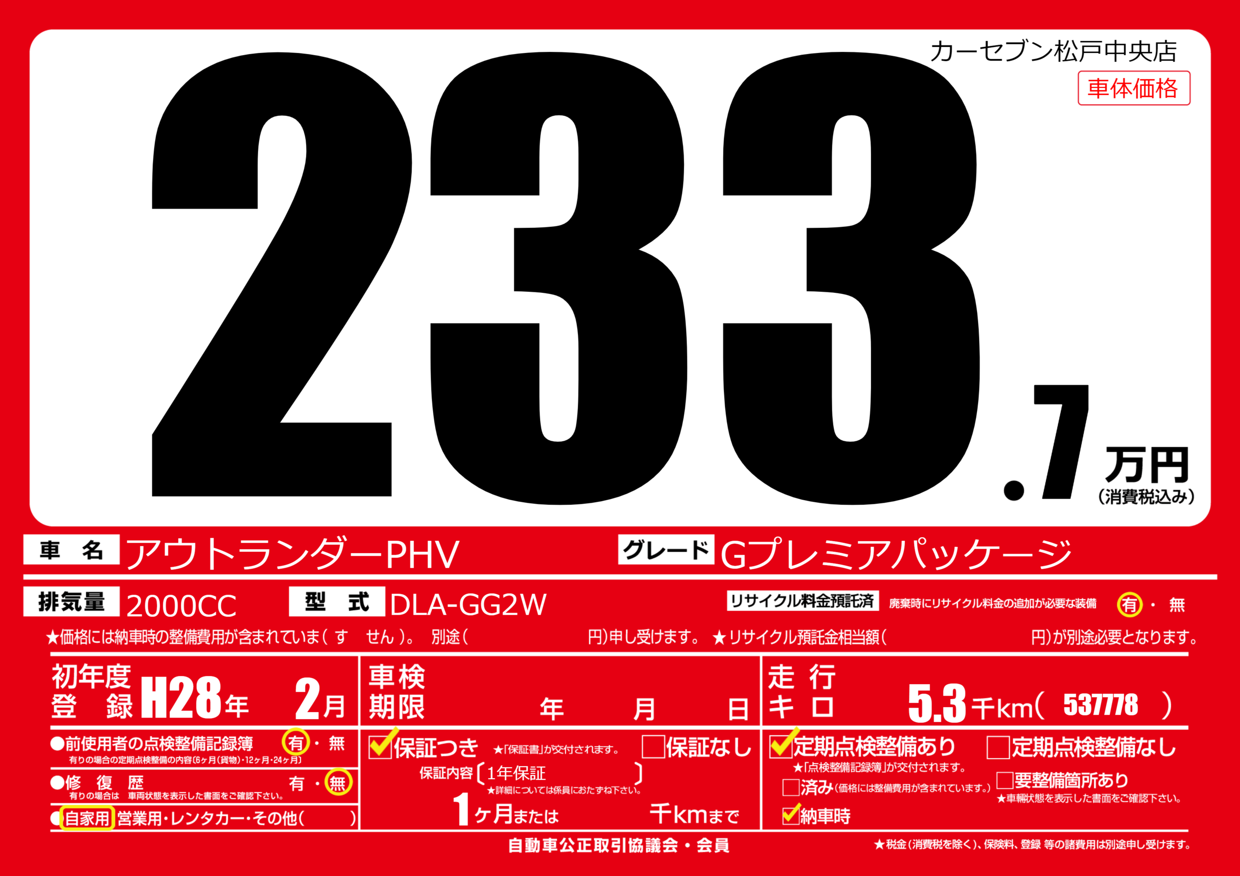 | 車名 | アウトランダーPHV | グレード ミッション 排気量 |